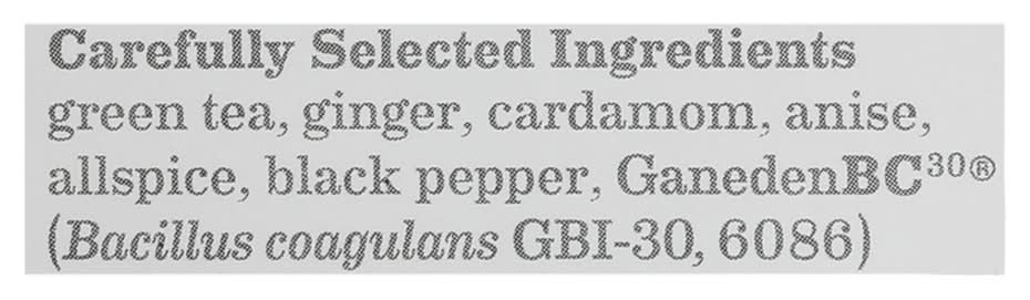 Ingredients: Green Tea, Ginger, Cardamom, Anise, Allspice, Black Pepper, BC30 (Bacillus Coagulans GBI-30, 6086)