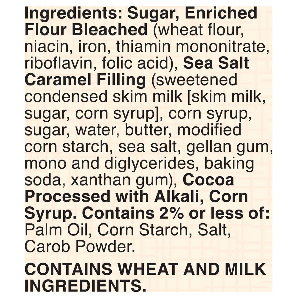 Ingredients: Sugar, Enriched Flour Bleached (Wheat Flour, Niacin, Iron, Thiamin Mononitrate, Riboflavin, Folic Acid), Sea Salt Caramel Filling (Sweetened Condensed Skim Milk [Skim Milk, Sugar, Corn Syrup], Corn Syrup, Sugar, Water, Butter, Modified Corn Starch, Sea Salt, Gellan Gum, Mono and Diglycerides, Baking Soda, Xanthan Gum), Cocoa Processed with Alkali, Corn Syrup. Contains 2% or Less of: Palm Oil, Corn Starch, Salt, Carob Powder Contains: Wheat, Milk, Corn