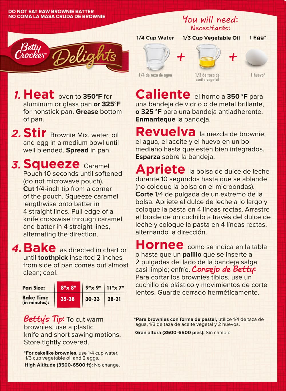You will need: 1/4 cup water + 1/3 cup vegetable oil + 1 egg (for cake like brownies, use 1/4cup water, 1/3 cup vegetable oil and 2 eggs). heat: oven to 350 degrees f for shiny metal or glass pan or 325 degrees f for nonstick pan. grease bottom of pan. stir brownie mix, water, oil and egg in a medium bowl until well blended. spread in pan. squeeze: caramel pouch 10 seconds until softened (do not microwave pouch). cut 1/4-inch tip from a corner of the pouch. squeeze caramel lengthwise onto batter in 4 straight lines. pull edge of a knife crosswise through caramel and batter in 4 straight lines, alternating the direction. bake: as directed in chart or until toothpick inserted 2 inches from side of pan comes out almost clean; cool. betty's tip: to cut warm brownies easily, use a plastic knife and short sawing motions. store tightly covered. pan size : 8 inches into 8 inches; bake time 35-38 minutes; pan size 9 inches into 9 inches; bake time 30-33 minutes; pan size 11 inches into 7 inches; bake time 28-31 minutes. high altitude (3500-6500 ft); no change.