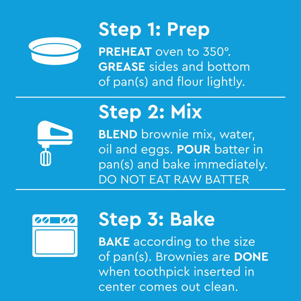You will need: 2 large eggs; water; vegetable oil. do not eat raw batter. fudgy brownies: 1 egg; 1/3 cup water; 1/3 cup oil. cake-like brownies: 2 eggs; 2 tbsp water; 1/3 cup oil. baking instructions: step (1) prep: preheat oven to 350 degrees f for metal and glass pan, 325 degrees f for dark or coated pan (add 3-5 minutes for dark or coated pan). grease bottom of pan. step (2) mix: empty brownie mix, eggs, water and oil in a large bowl. stir until well blended (about 50 strokes). spread into greased pan. drizzle the caramel in lines across the pan. using the tip of a knife, drag it through the batter and caramel to get desired marble effect. step (3) bake in center of oven at 350 degrees f following chart below. add 3-5 minutes for dark or coated pan. brownie is done when toothpick inserted 1 inch from the edge of pan comes out clean. cool completely in pan on wire rack before cutting and serving. baking tip: sprinkle with sea salt for a hint of extra flavor. high altitude (over 3,500 ft): preheat oven to 350 degrees f stir 2 tbsp flour into brownie mix. mix according to the directions in step 2. bake at 350 degrees f. 8 x 8 inch pan 35-37 min; 9 x 9 inch pan 30-32 min. lower fat recipe: prepare and bake brownie following directions above except using 1 egg, 1 tbsp water, and 1/3 cup unsweetened applesauce. reduce baking time 1-2 minutes. pan size: 8x8 inch; 35-38 min bake time. 9x9 inch; 30-33 min bake time. yummy no matter how you bake it! bake in a skillet top with ice cream. bake in a skillet top with ice cream.
