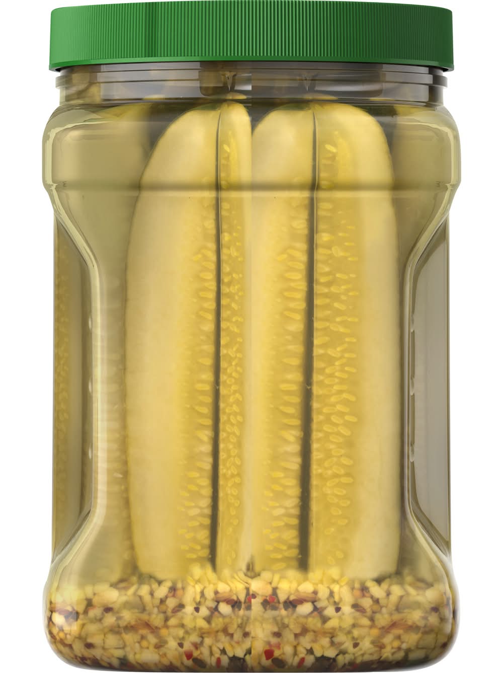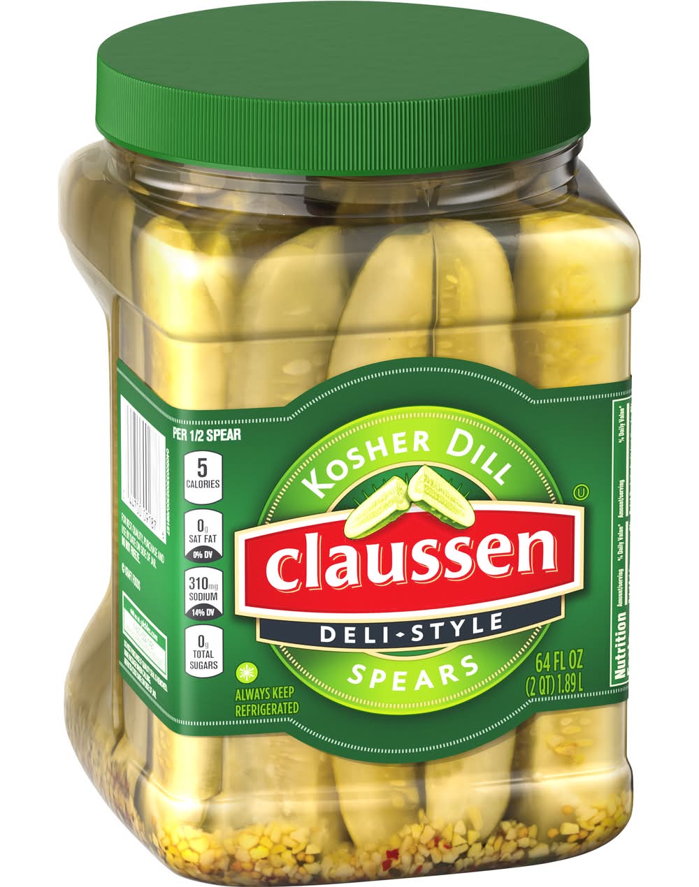 Our Claussen Kosher Dill Spears are crafted with fresh cucumbers picked straight from the vine and refrigerated for our classic Claussen crunch. Pickled with a unique spice blend of turmeric, garlic and red pepper, our Claussen spears are the perfect snack or pairing for your meal. Claussen pickle spears are vegan, Kosher Certified and a fat free food. Claussen pickles are always refrigerated for superior crunch and freshness. Keep our 64-ounce resealable jar of deli-style pickle spears refrigerated. Whether you enjoy pickle chips or spears, slices or wholes, you can't beat Claussen's mouthwatering crunch. • Number of servings: 34 • Kraft Heinz Foods Company, Chicago, IL, 60601