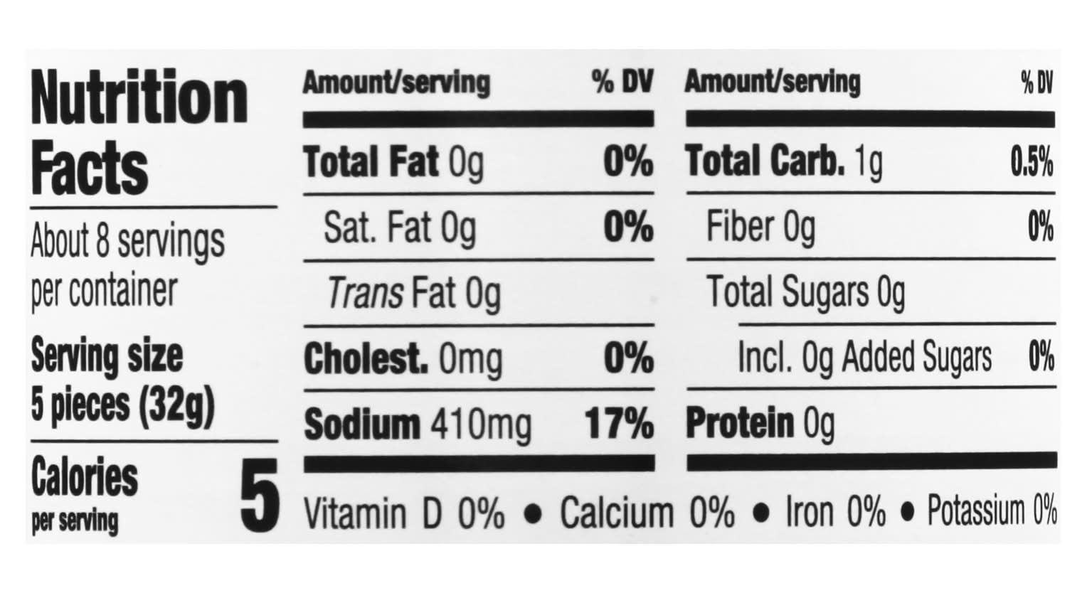 Ingredients: Cauliflower, Water, Distilled Vinegar, Jalapeno Peppers, Carrots, Celery, Sea Salt, Red Bell Peppers, Pickles (Cucumbers, Water, Distilled Vinegar, Salt, Calcium Chloride, Natural Flavors, Turmeric), Sodium Metabisulfite (Added as a Color Stabilizer) Contains: Celery, Sulfites