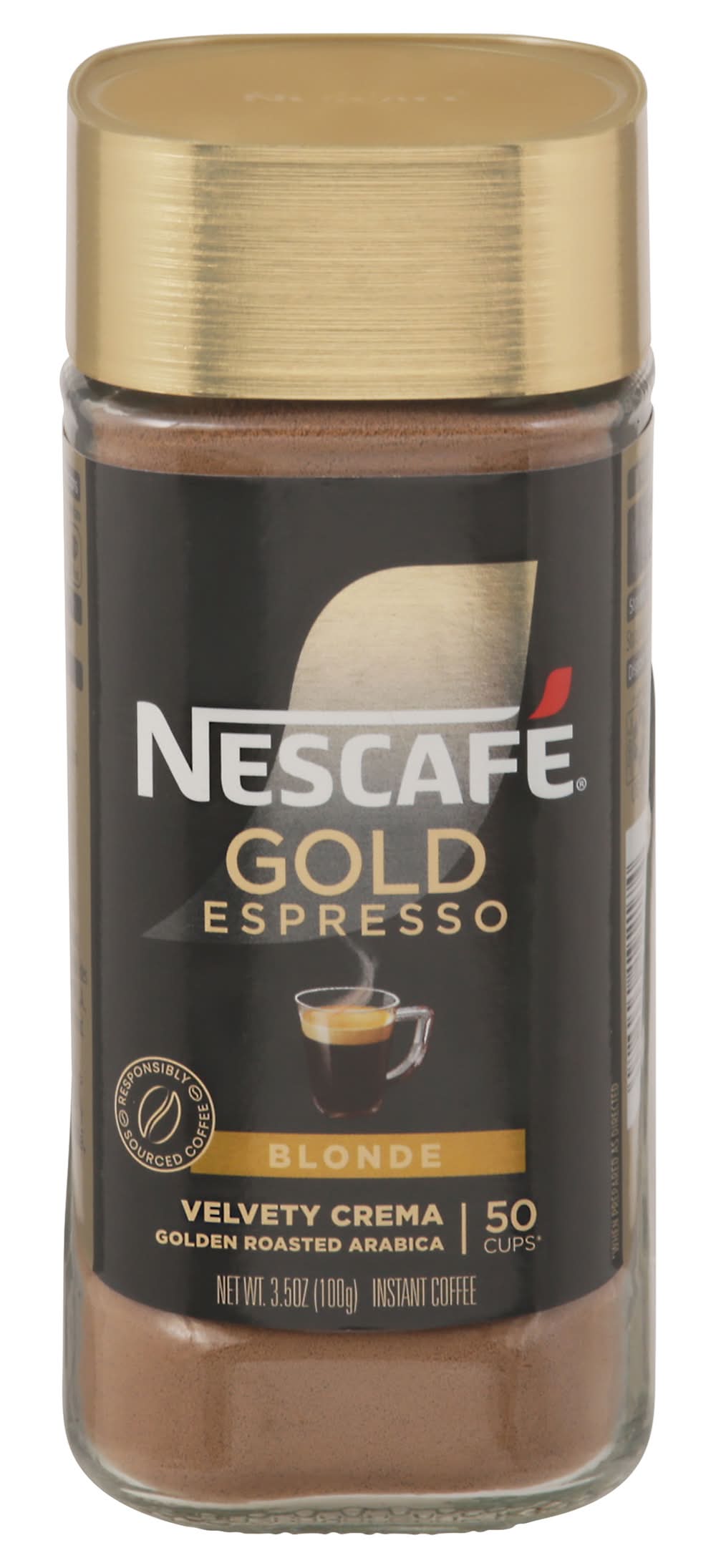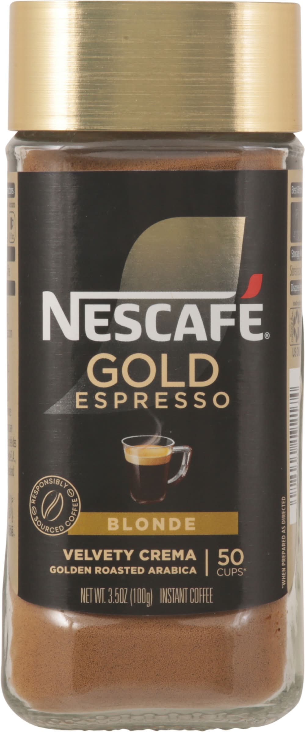 Delve into an espresso experience crafted for you to enjoy any way you like—introducing NESCAFÉ Gold Espresso Blonde. A high-quality instant espresso, NESCAFÉ Gold Espresso delivers café-style crema with a velvety, smooth taste. Responsibly sourced using golden-roasted Arabica coffee beans, this rich, smooth coffee is ready in an instant without expensive equipment. When prepared as directed, this 3.5-ounce jar makes up to 50 cups of espresso as a base for an Americano and other café-style beverages, no machine needed. You want to succeed your way, so start your day strong and make your world. Elevate your coffee moments with the world’s best-selling coffee brand,* NESCAFÉ. *Based on 2020 global retail sales data reported by independent research company comparing brands of coffee. Packaging: Reusable