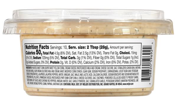 Fresh From Meijer Fire Roasted Street Corn Dip combines roasted sweet corn with jalapenos, parmesan cheese, and green onion, all blended into a creamy base of cream cheese and soft cream. This dip is enhanced with a mix of spices, making it an ideal accompaniment for chips.