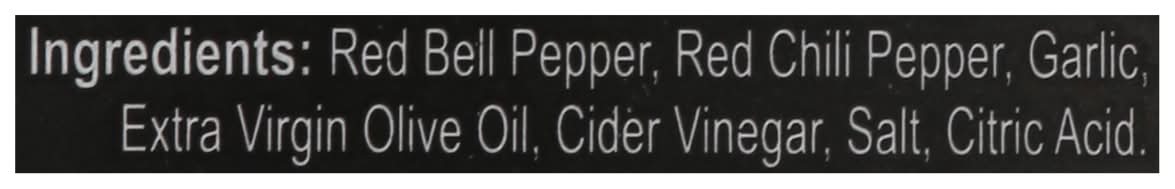 Ingredients: Red Bell Pepper, Red Chili Pepper, Garlic Extra Virgin Olive Oil, Cider Vinegar, Salt, Citric Acid