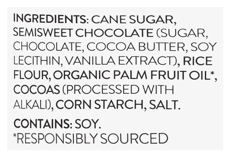 Ingredients: Cane Sugar, Semisweet Chocolate (Sugar, Chocolate, Cocoa Butter, Soy Lecithin, Vanilla Extract), Rice Flour, Organic Palm Fruit Oil (Responsibly Sourced), Cocoas (Processed with Alkali) Cornstarch, Salt Contains: 'Soybeans Contains'