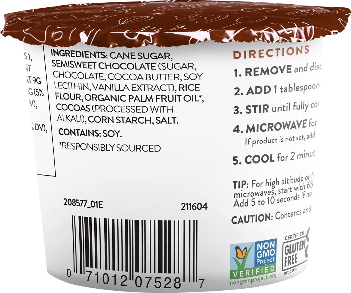 Directions: 1. remove and discard lid. 2. add 1 tablespoon of water. 3. stir until fully combined. 4. microwave for 30 seconds. if product is not set, add 5 to 10 seconds. 5. cool for 2 minutes. enjoy! tip: for high altitude or low wattage microwave, start with 65 seconds. add 5 to 10 seconds if needed. caution: contents and cup will be hot.