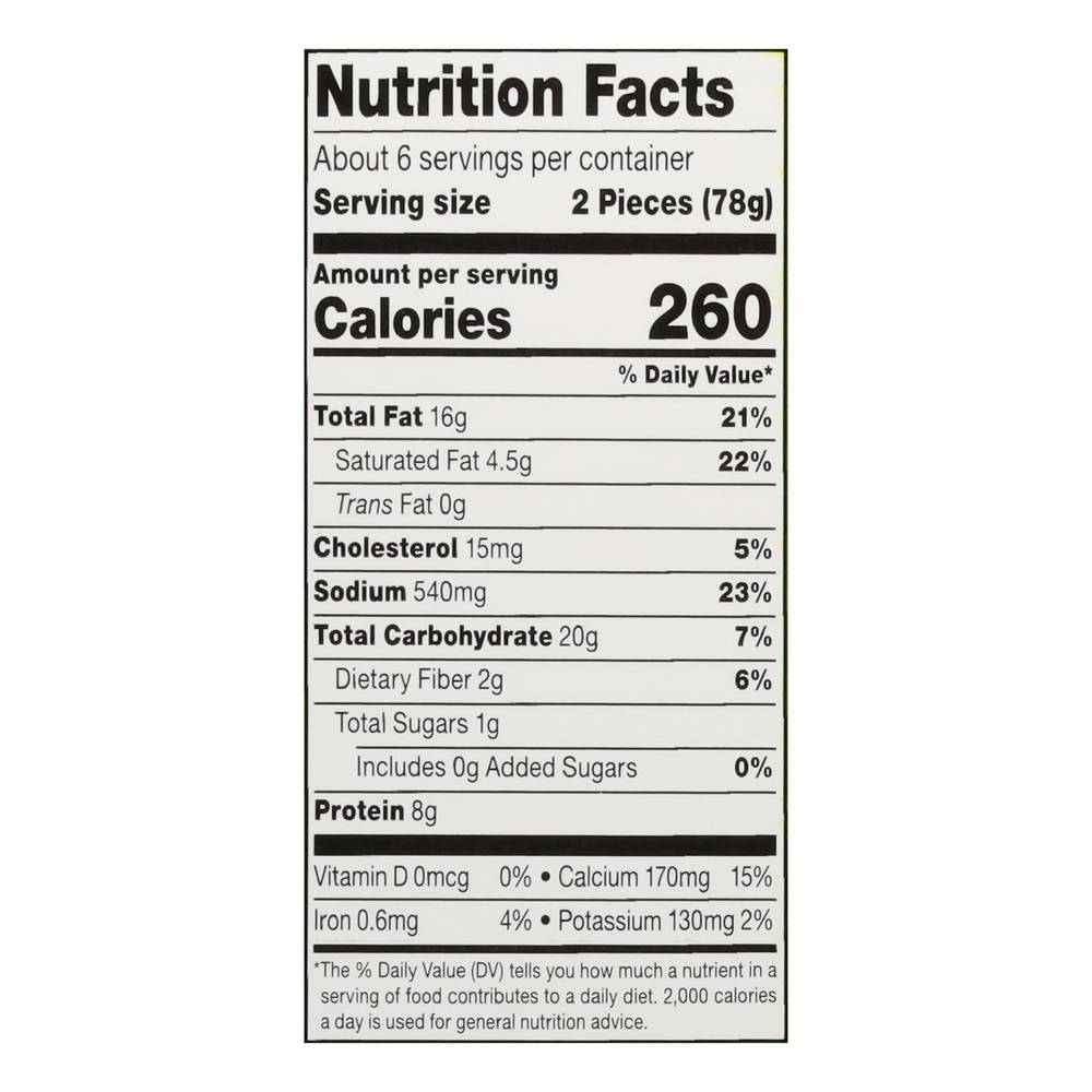 Ingredients: Low Moisture Part Skim Mozzarella Cheese (Pasteurized Part Skim Milk, Cheese Cultures, Salt, Enzyme), Buffalo Style Sauce (Water, Frank's Original Pepper Sauce [Aged Cayenne Red Peppers, Distilled Vinegar, Water, Salt, Garlic Powder], Soybean Oil, Tomato Paste, Modified Corn Starch, Natural Flavor, Garlic Powder, Cellulose Gum, Xanthan Gum, Chili Pepper, Yeast Extract, Citric Acid, to Preserve Freshness [Potassium Sorbate, Sodium Benzoate], Paprika Oleoresin [Color]), Whole Wheat Flour, Wheat Flour, Soybean Oil, Whey, Water, Yellow Corn Flour, Contains Less than 2% of the Following: Modified Corn Starch, Dried Frank's Redhot Cayenne Pepper Sauce (Aged Cayenne Red Peppers, Distilled Vinegar, Salt, Garlic Powder), Maltodextrin, Dried Vinegar, Chili Pepper, Yeast, Salt, Paprika Extract (Color), Methylcellulose, Sugar, Natural Flavor Contains: Milk, Wheat, Soybeans, Corn