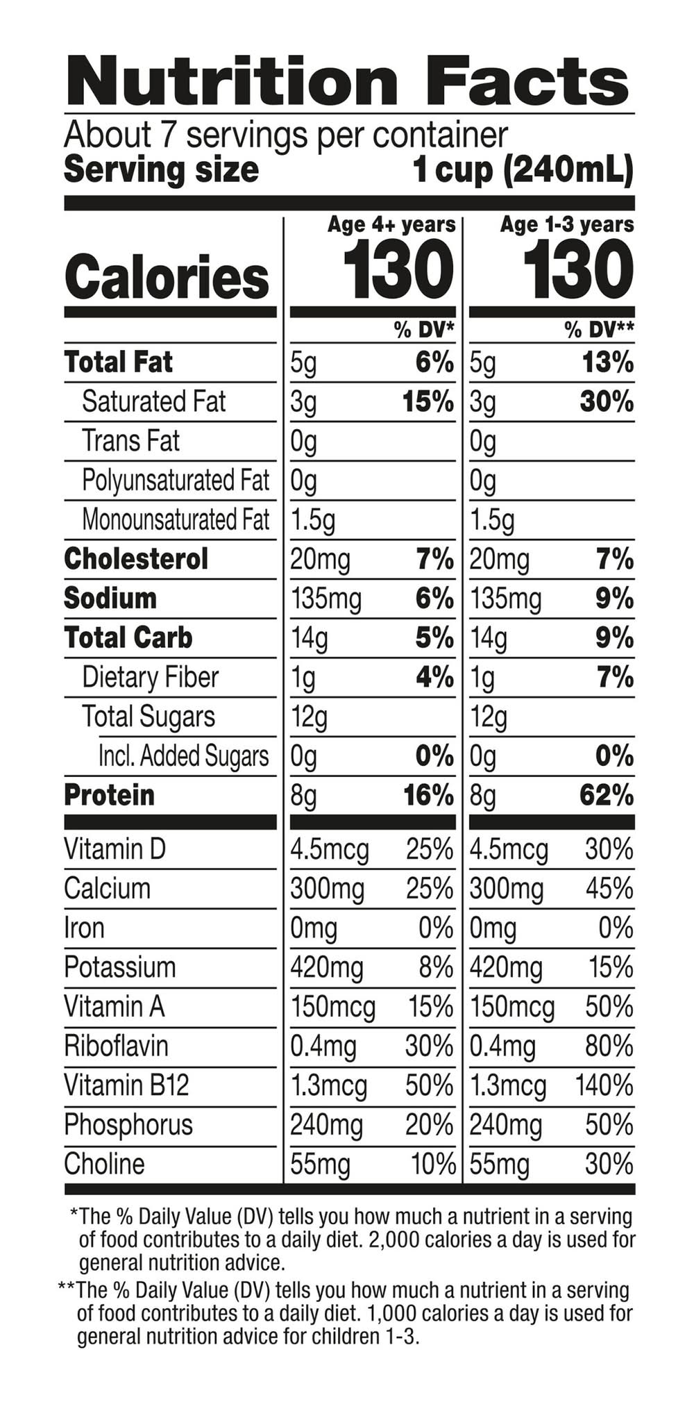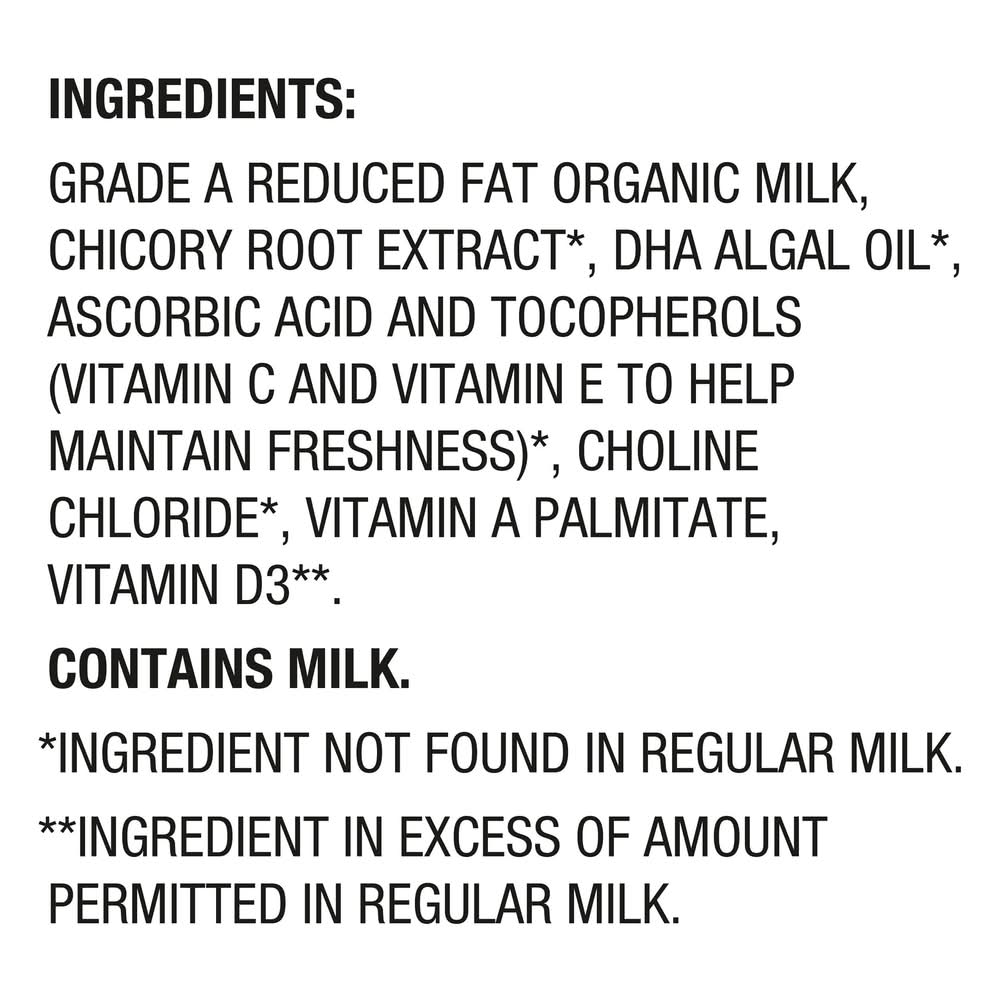 Ingredients: Grade A Reduced Fat Organic Milk, Chicory Root Extract (Ingredient Not Found in Regular Milk), DHA Algal Oil (Ingredient Not Found in Regular Milk), Ascorbic Acid and Tocopherols (Vitamin C and Vitamin E to Help Maintain Freshness) (Ingredient Not Found in Regular Milk), Choline Chloride, Vitamin A Palmitate, Vitamin D3 (Ingredient in Excess of Amount Permitted in Regular Milk) Contains: Milk