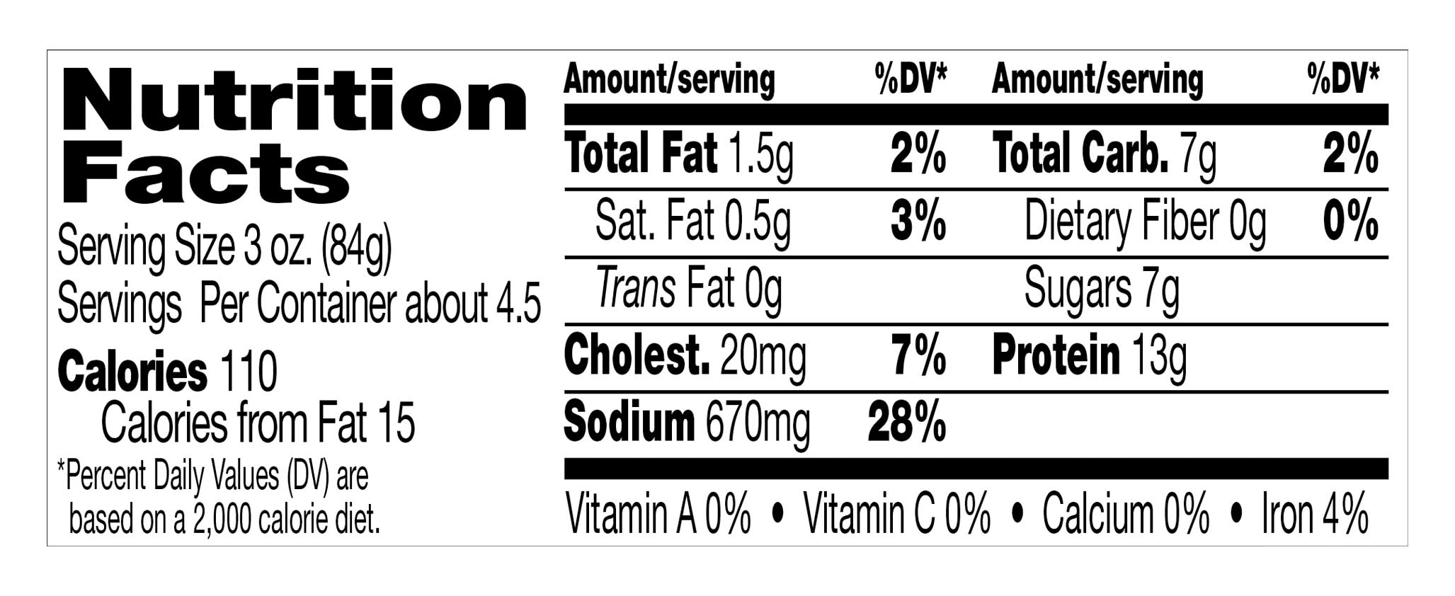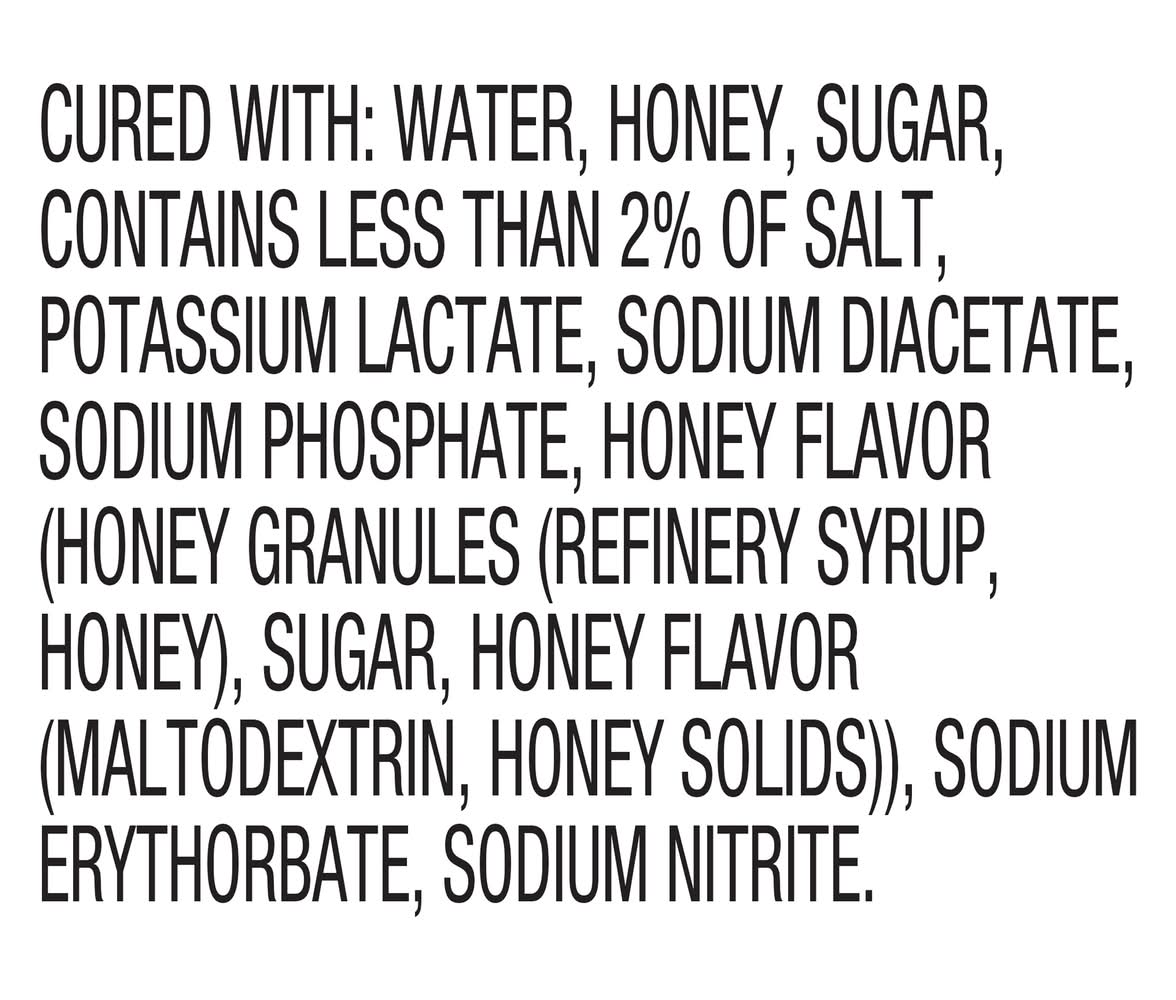 Ingredients: Cured with: Water, Honey, Sugar, Contains Less than 2% of Salt, Potassium Lactate, Sodium Diacetate, Sodium Phosphate, Honey Flavor (Honey Granules (Refinery Syrup, Honey), Sugar, Honey Flavor (Maltodextrin, Honey Solids)), Sodium Erythorbate, Sodium Nitrite