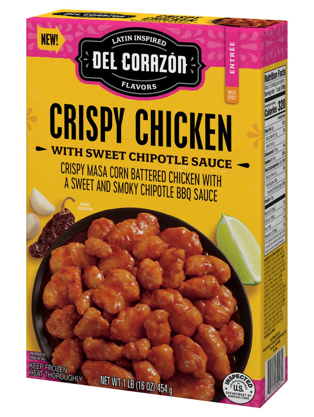 Ingredients: Battered Chicken: White Chicken Meat, Water, Bleached Enriched Flour (Wheat Flour, Niacin, Iron, Thiamine Mononitrate, Riboflavin, Folic Acid), Rice Flour, White Corn Masa Flour with Trace of Lime, Contains Less than 2% of Corn Flour, Egg Whites, Garlic Powder, Leavening (Sodium Acid Pyrophosphate, Sodium Bicarbonate, Monocalcium Phosphate), Malted Barley Flour, Natural Flavor, Onion Powder, Rice Flour, Salt, Sodium Phosphate, Spices, Sugar, Wheat Starch, Yellow Corn Meal, Fully Cooked in Vegetable Oil, Sauce: Sugar, Water, Pineapple Juice Concentrate, Vinegar, Tomato Paste, Mango Puree, Molasses, Salt, Modified Food Starch, Garlic Powder, Chipotle Pepper, Spices Contains: Eggs, Wheat, Barley