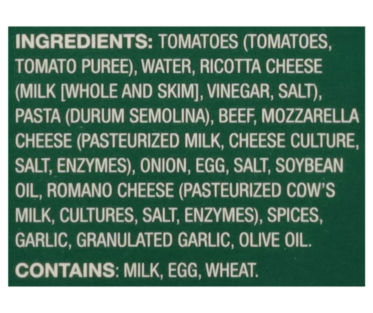 Ingredients: Tomatoes (Tomatoes Tomato Puree), Water, Ricotta Cheese (Milk [Whole and Skim], Vinegar, Salt), Pasta (Durum Semolina), Beef, Mozzarella Cheese (Pasteurized Milk, Cheese Culture Salt, Enzymes), Onion, Egg, Salt, Soybean Oil, Romano Cheese (Pasteurized Cow's Milk, Cultures, Salt, Enzymes), Spices, Garlic, Granulated Garlic, Olive Oil Contains: Milk, Eggs, Soybeans