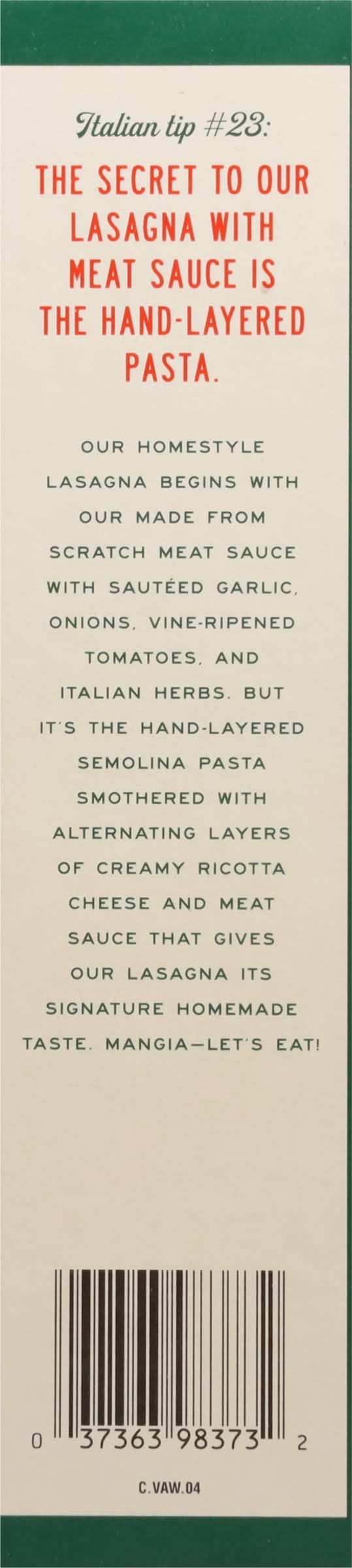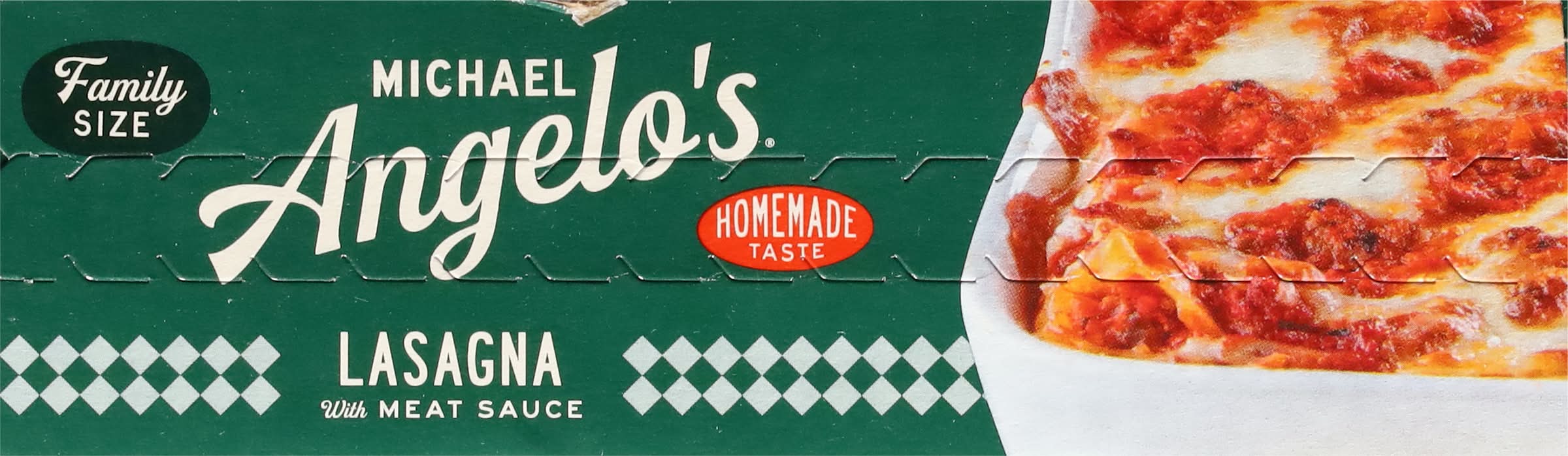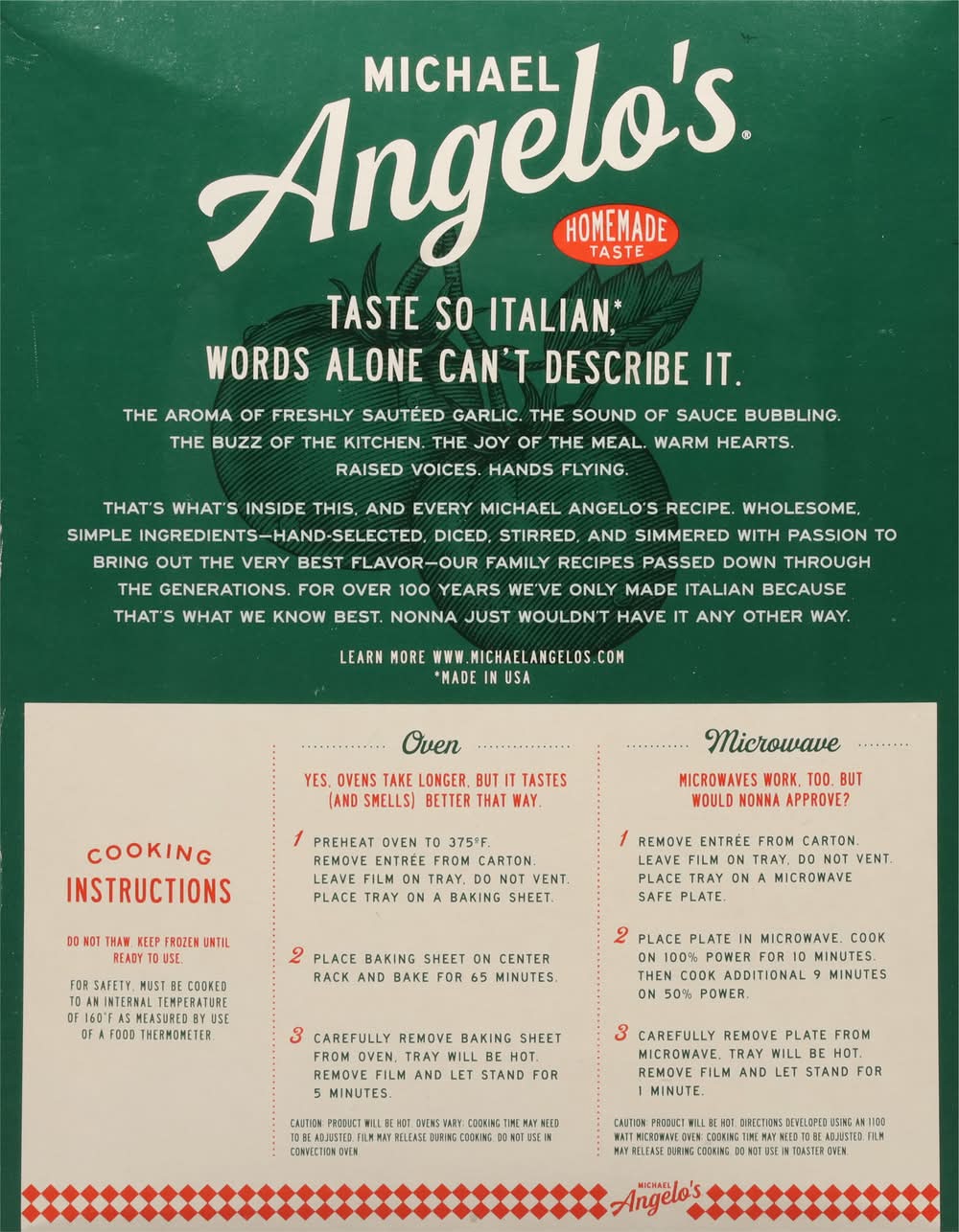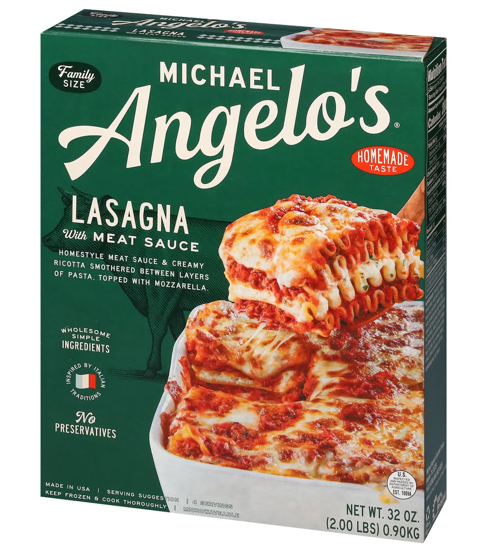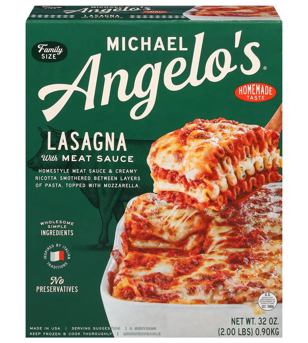 Homestyle meat sauce & creamy ricotta smothered between layers of pasta, topped with mozzarella. Wholesome simple ingredients. 4 Servings. Inspired by Italian Traditions. Microwaveable. Homemade taste. Italian tip No 23: The secret to our lasagna with meat sauce is the hand-layered pasta. Our homestyle Lasagna begins with our made from scratch meat sauce with sauteed garlic, onions, vine-ripened tomatoes, and Italian herbs, but it's the hand-layered semolina pasta smothered with alternating layers of creamy ricotta cheese and meat sauce that gives our Lasagna its signature homemade taste. Mangia-let's eat. Taste so Italian (Made in USA), words alone can't describe it. The aroma of freshly sauteed garlic. the sound of sauce bubbling the buzz of the kitchen. The joy of the meal. Warm hearts. Raised voices. Hands flying. That’s what's inside this, and every Michael Angelo's recipe. wholesome, simple ingredients-hand-selected, diced, stirred, and simmered with passion to bring out the very best flavor-our family recipes passed down through. The generations. for over 100 years we've only made Italian because that's what we know best. • Michael Angelo's Gourmet Foods, Inc, Austin,TX,78728 • Packaging: Reusable