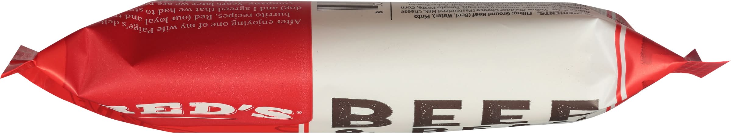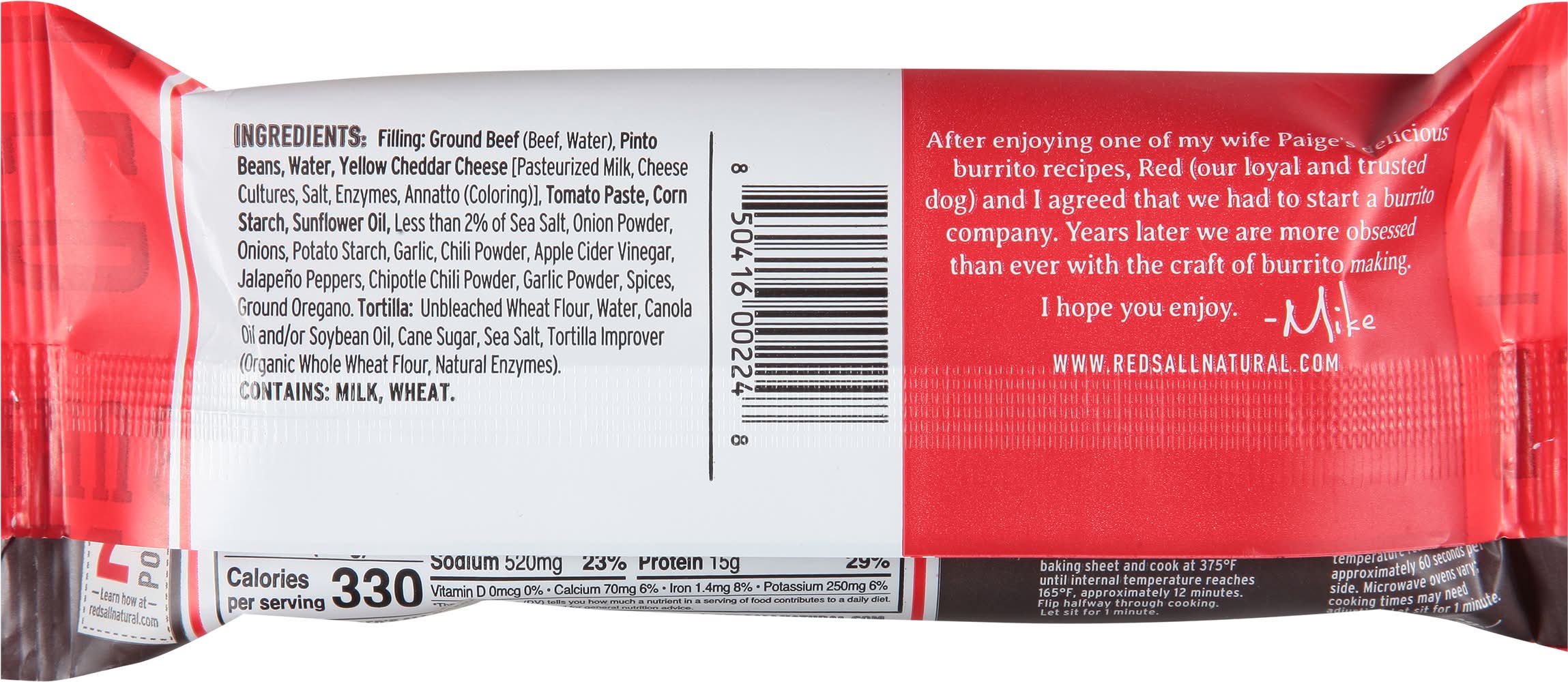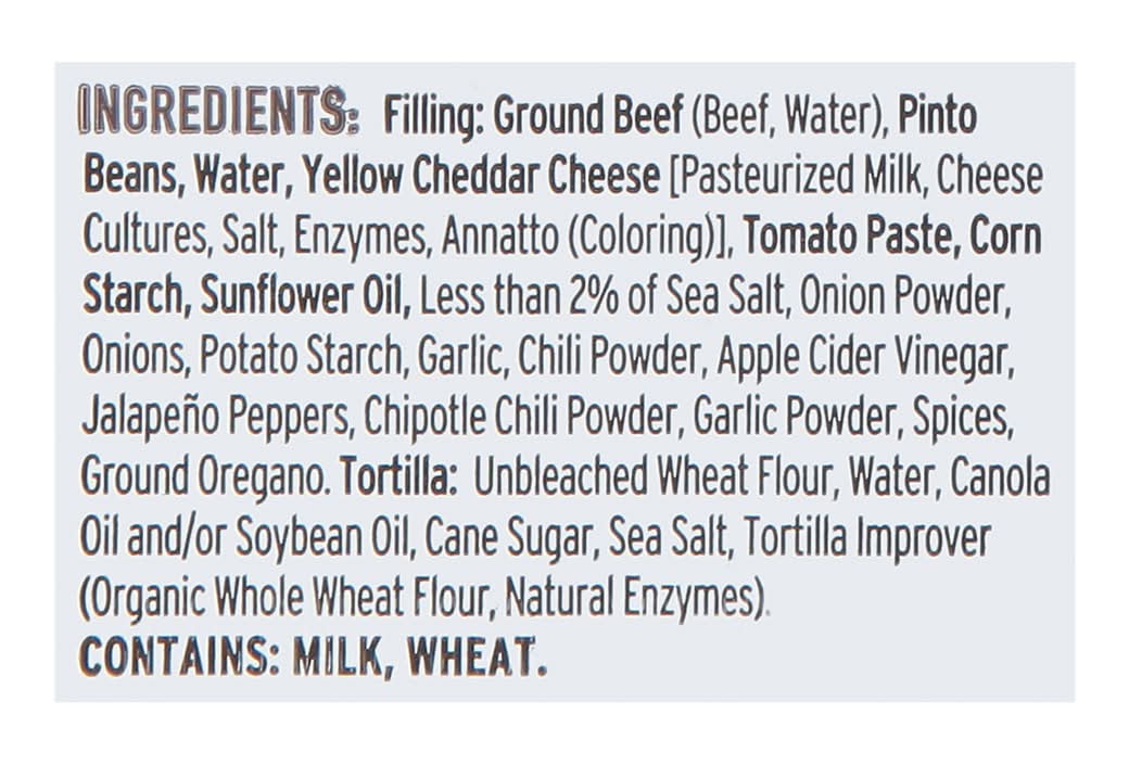 Ingredients: Filling: Ground Beef (Beef, Water), Pinto Beans, Water, Yellow Cheddar Cheese [Pasteurized Milk, Cheese Cultures, Salt, Enzymes, Annatto (Coloring)], Tomato Paste, Corn Starch, Sunflower Oil, Less than 2% of Sea Salt, Onion Powder, Onion, Potato Starch, Garlic, Chili Powder, Apple Cider Vinegar, Jalapeno Peppers, Chipotle Chili Powder, Garlic Powder, Spices, Ground Oregano. Tortilla: Unbleached Wheat Flour, Water, Canola Oil and/or Soybean Oil, Cane Sugar, Sea Salt, Tortilla Improver (Organic Whole Wheat Flour, Natural Enzymes) Contains: Milk, Wheat, Corn, Soybeans