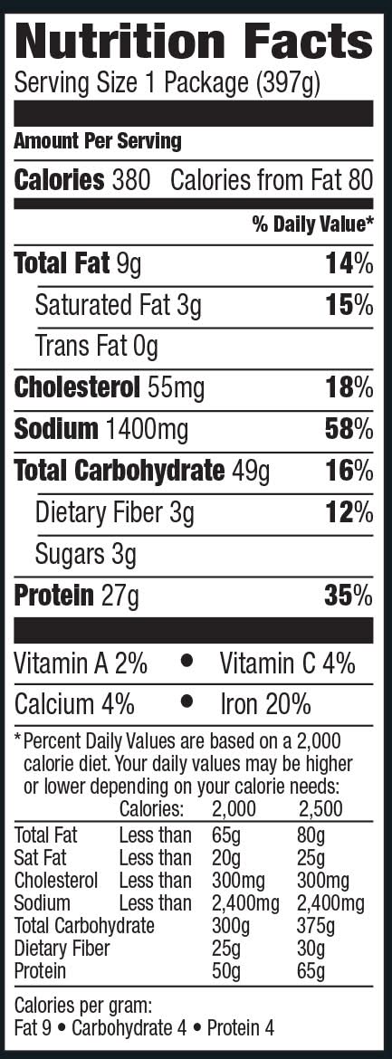 Directions for use: Cook thoroughly. For food safety & quality, follow these cooking instructions. Keep frozen until ready to use. Microwave Oven (1100-Watts): (1) Remove tray from carton. Do not pierce or remove film. (2) Cook on high for 4-1/2 minutes. (3) Stir and re-cover. (4) Cook again on high for 2-1/2 to 3 minutes. Let stand 1 to 2 minutes. Conventional Oven: Preheat 350 degrees F. Remove tray from carton. Do not pierce or remove film. Place tray on baking sheet, center rack. Bake 30 minutes, stir and re-cover. Bake again 15 minutes. Stir and enjoy! Caution: Product will be hot. Use care when removing film as hot steam may escape. Cook thoroughly to an internal temperature of at least 165 degrees F. Ovens vary; cooking time may need adjusting. Do not prepare in toaster oven. Do not reheat tray. Keep frozen. Storage recommendation: Keep frozen.