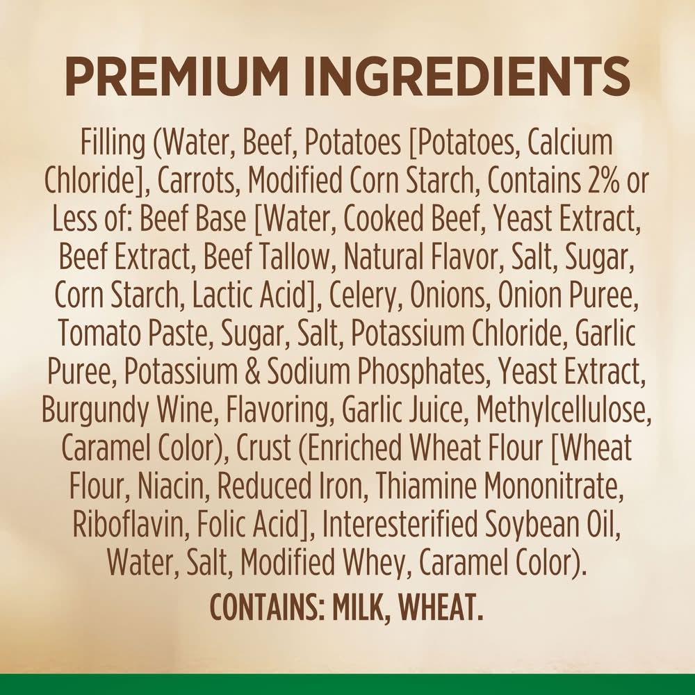 Ingredients: Filling: _x000D_ Water, Beef and Binder Product (Beef, Water, Contains 2% or less of: Dextrose, Salt, Natural Flavor, Maltodextrin, Dried Whey, Dried Cauliflower, Sesame Oil, Soybean Oil, Modified Corn Starch, Sodium Phosphate, Caramel Color, Spice Extractives), Potatoes (Potatoes, Calcium Chloride), Beef Crumbles (Beef, Salt, Garlic Juice, Flavoring), Carrots, Onions, Modified Corn Starch, Contains 2% or less of: Celery, Beef Flavor (Cooked Beef, Yeast Extract, Beef Tallow, Beef Extract, Flavoring, Salt, Sugar, Vegetable Juice Concentrates [Onion, Carrot, Celery], Lactic Acid), Wine, Tomato Paste, Sugar, Potassium Chloride, Canola Oil, Garlic, Butter (Cream, Salt), Salt, Yeast Extract, Flavoring, Methylcellulose, Caramel Color._x000D_ Crust: _x000D_ Enriched Wheat Flour (Wheat Flour, Niacin, Reduced Iron, Thiamine Mononitrate, Riboflavin, Folic Acid), Interesterified Soybean Oil, Water, Salt, Modified Whey, Caramel Color. CONTAINS: MILK, WHEAT. Contains: Celery (EU), Milk, Sesame, Wheat