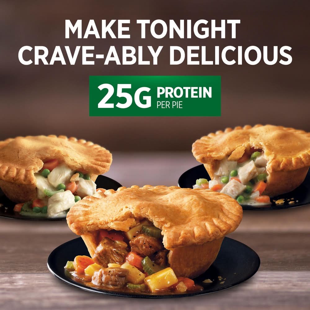 Directions for use: Microwave Oven (Cook only one at a time): 1: Open carton at push tab; peel back along perforations and completely tear off top of carton. Slit top crust. Cook in carton with top off. 2: Microwave in open carton on high 9 to 10 minutes. Do not cook in microwave ovens below 1100 watts as pot pie may not cook thoroughly. Conventional oven preparation is recommended. Let stand 5 minutes in microwave to complete cooking. Remove carefully; it's hot! 3: Check that pot pie is cooked thoroughly. Conventional Oven (Do not prepare in toaster oven): 1: Preheat oven to 400 degrees F. Remove pot pie from outer carton; leave pot pie in paper tray. Wrap crust edge with strip of aluminum foil. 2: Cook on baking sheet 60 to 65 minutes. Remove carefully; it's hot! 3: Let stand 5 minutes to complete cooking. 4: Check that pot pie is cooked thoroughly. Internal temperature needs to reach 165 degrees F as measured by a food thermometer in several spots. Crust is golden brown and steam rises from filling. Food Safety and Quality: Keep frozen; do not thaw. Appliances vary. Adjust cooking times as needed. Food must be cooked thoroughly. Read and follow these cooking directions. Keep frozen. Tear off top completely before microwaving. Push to open. Storage recommendation: Keep frozen.