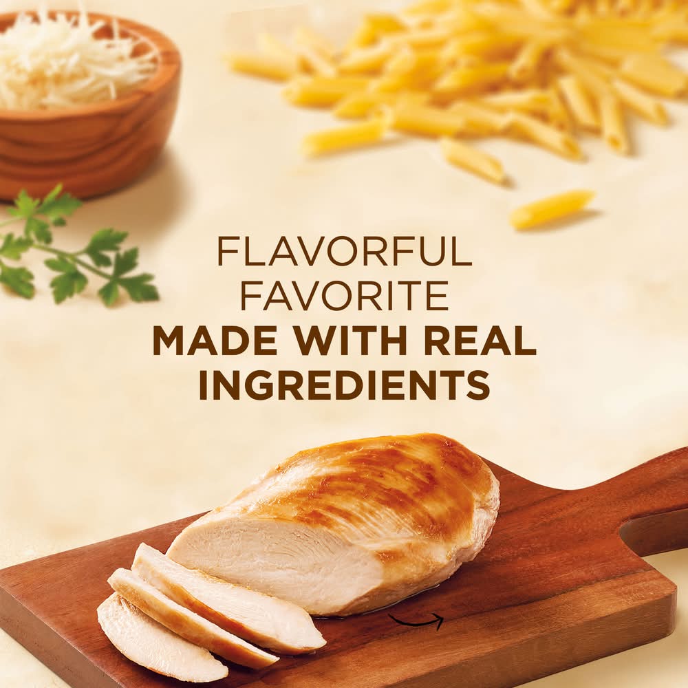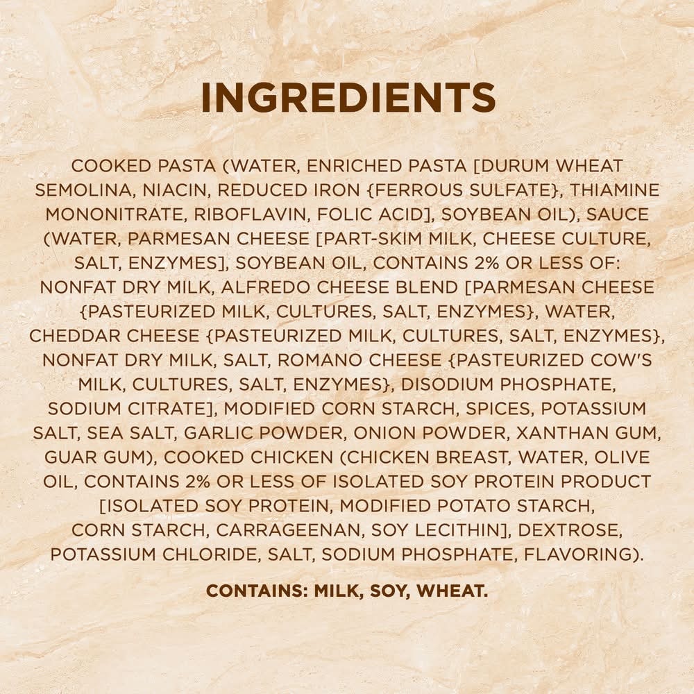 Ingredients: Cooked Pasta (Water Enriched Pasta (Durum Wheat Semolina Niacin Reduced Iron (Ferrous Sulfate), Thiamine Mononitrate, Riboflavin, Folic Acid], Soybean Oil), Sauce (Water Parmesan Cheese [Part-Skim Milk Cheese Culture Salt Enzymes] Soybean Oil Contains 2% or Less of: Nonfat Dry Milk Alfredo Cheese Blend [Parmesan Cheese (Pasteurized Milk Cultures Salt Enzymes), Water, Cheddar Cheese (Pasteurized Milk Cultures Salt Enzymes), Nonfat Dry Milk, Salt, Romano Cheese (Pasteurized Cow's Milk Cultures Salt Enzymes), Disodium Phosphate, Sodium Citrate], Modified Corn Starch, Spices, Potassium Salt, Sea Salt, Garlic Powder, Onion Powder, Xanthan Gum, Guar Gum), Cooked Chicken (Chicken Breast Water Olive Oil Contains 2% or Less of Isolated Soy Protein Product [Isolated Soy Protein Modified Potato Starch Corn Starch Carrageenan Soy Lecithin] Dextrose Potassium Chloride Salt Sodium Phosphate Flavoring) Contains: Milk, Soybeans, Wheat, Corn