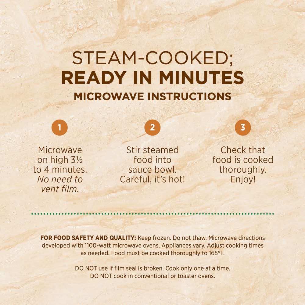 Microwave oven: 1. 3-1/2 - 4 min.: microwave on high 3-1/2 to 4 minutes. no need to vent film. 2. stir steamed food into sauce bowl. careful, it's hot! 3. 165 degrees f: check that food is cooked thoroughly. enjoy! do not use if film is broken. cook only one at a time. do not cook in conventional or toaster ovens. for food safety and quality: keep frozen. do not thaw. microwave directions developed with 1100-watt microwave ovens. appliances vary. adjust cooking times as needed. food must be cooked thoroughly to 165 degrees f. read and follow these cooking directions.