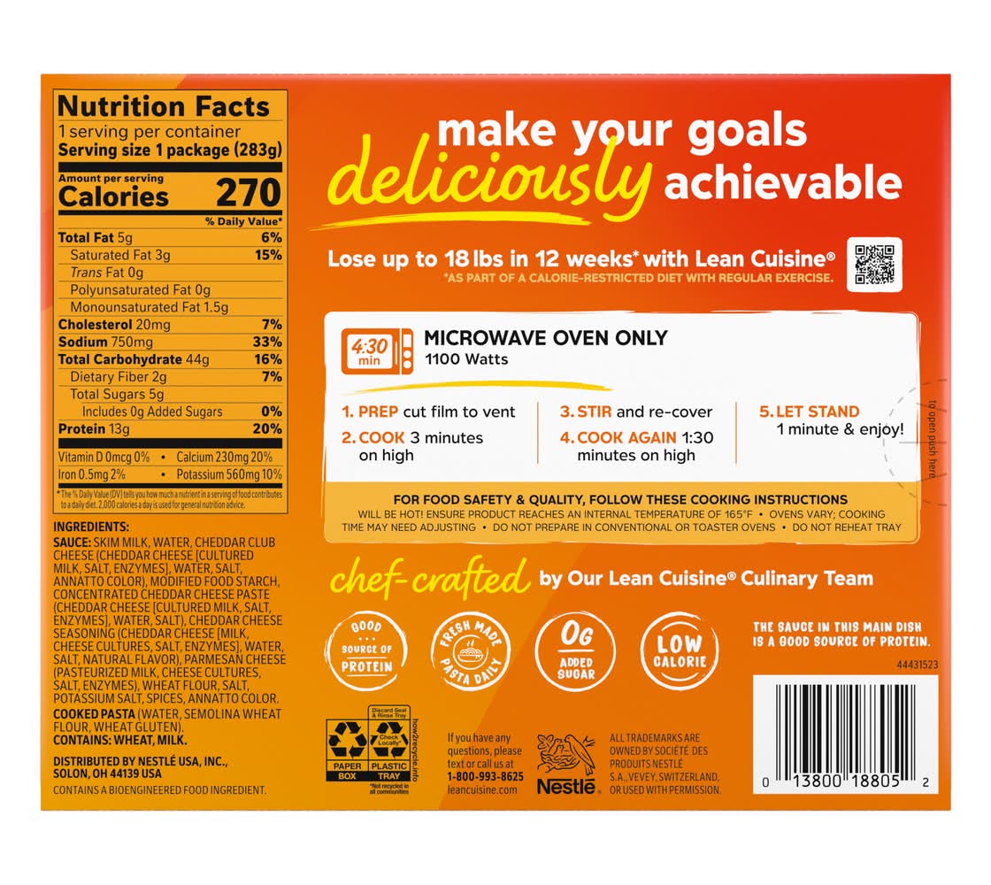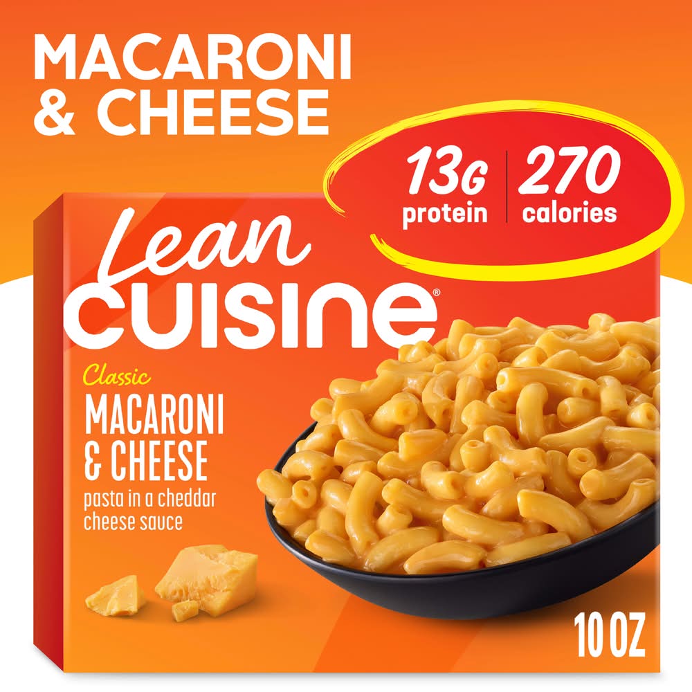 Progress never tasted this good -- Lean Cuisine Macaroni & Cheese is a quick, satisfying option for busy weeknights. This frozen meal features classic macaroni & cheese pasta in a cheddar cheese sauce for real comfort you can feel good about. Whenever you're searching for perfectly portioned meals that fit into your routine, think of Lean Cuisine frozen dinner. Whether you're stocking up on convenient frozen dinners or looking for diet food that fits your meal plan goals, Lean Cuisine makes it easy to stay on track. These frozen single meals have 13g of protein, making them a great option to help hit your macros. Simply microwave and enjoy — no prep, no cleanup, just smart eating made simple.