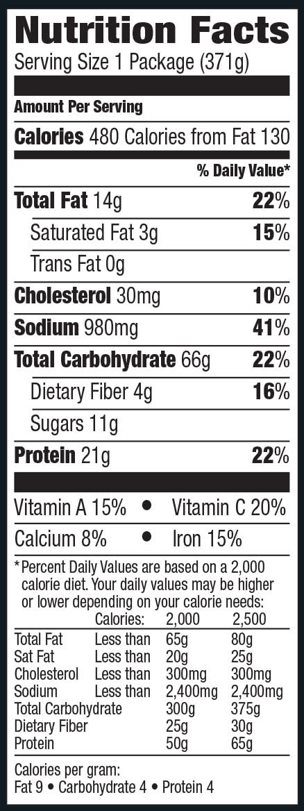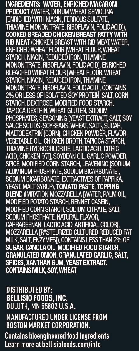 Ingredients: Water, Cooked Enriched Macaroni Product Water, Durum Wheat Semolina [Enriched with Niacin, Ferrous Sulfate, Thiamine Mononitrate, Riboflavin, Folic Acid], Cooked Breaded Chicken Breast Patty with Rib Meat Chicken Breast with Rib Meat, Water, Enriched Wheat Flour [Wheat Flour, Wheat Starch, Niacin, Reduced Iron, Thiamine Mononitrate, Riboflavin, Folic Acid], Enriched Bleached Wheat Flour [Wheat Flour, Wheat Starch, Niacin Reduced Iron, Thiamine Mononitrate, Riboflavin, Folic Acid], Contains 2% or Less of Isolated Soy Protein, Salt, Corn Starch, Dextrose, Modified Food Starch, Tapioca Dextrin, Wheat Gluten, Sodium Phosphates, Seasoning Yeast Extract, Salt, Soy Sauce Solids {Soybeans, Wheat, Salt}, Sugar Maltodextrin {Corn}, Chicken Powder, Flavor, Vegetable Oil, Chicken Broth, Tapioca Starch, Thiamine Hydrochloride, Lactic Acid, Citric Acid, Chicken Fat], Soybean Oil, Garlic Powder, Spice, Modified Corn Starch, Leavening [Sodium Aluminum Phosphate, Sodium Bicarbonate], Sodium Bicarbonate, Extractives of Paprika, Yeast, Malt Syrup, Tomato Paste, Topping Blend Imitation Mozzarella [Water, Palm Oil, Modified Potato Starch, Rennet Casein, Modified Corn Starch, Sodium Citrate, Salt, Sodium Phosphate, Natural Flavor, Carrageenan, Lactic Acid, Artificial Color], Mozzarella [Pasteurized Cultured Reduced Fat, Milk, Salt, Enzymes], Contains Less than 2% of Sugar, Canola Oil, Modified Corn Starch, Granulated Onion, Granulated Garlic, Salt, Spices, Xanthan Gum, Yeast Extract. Contains: Milk, Soybeans, Wheat, Gluten