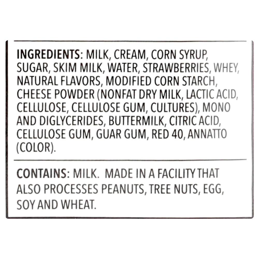Ingredients: Milk, Cream, Corn Syrup, Sugar, Skim Milk, Water, Strawberries, Whey, Natural Flavors, Modified Corn Starch, Cheese Powder (Nonfat Dry Milk Lactic Acid Cellulose Cellulose Gum Cultures), Mono and Diglycerides, Buttermilk, Citric Acid, Cellulose Gum, Guar Gum, Red 40, Annatto (Color) Contains: Milk, Peanuts, Tree Nuts, Eggs, Soybeans, Wheat