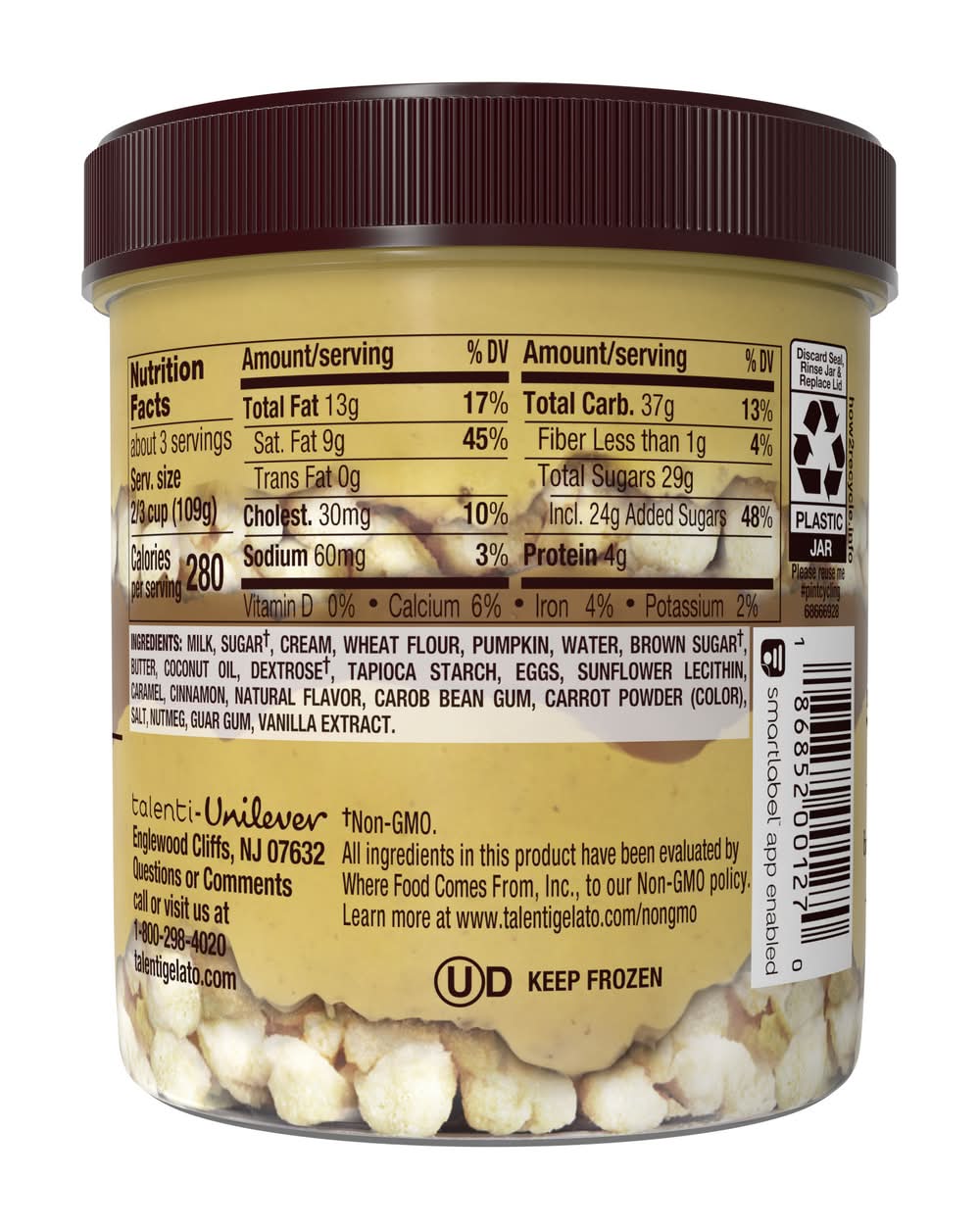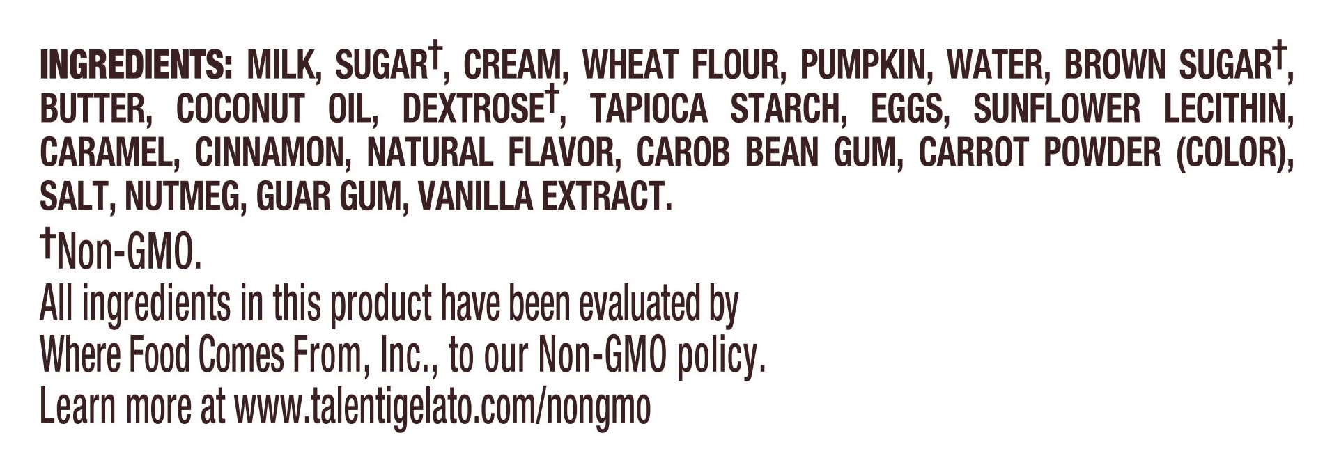 Ingredients: Milk, Sugar Non-GMO, Cream, Wheat Flour, Pumpkin, Water, Butter, Brown Sugar Non-GMO, Coconut Oil, Dextrose Non-GMO, Tapioca Starch, Egg, Sunflower Lecithin, Cinnamon, Natural Flavor, Carob Bean Gum, Salt, Carrot Powder Color, Nutmeg, Guar Gum, Vanilla Extract. Contains: Milk Wheat Eggs Tree Nuts
