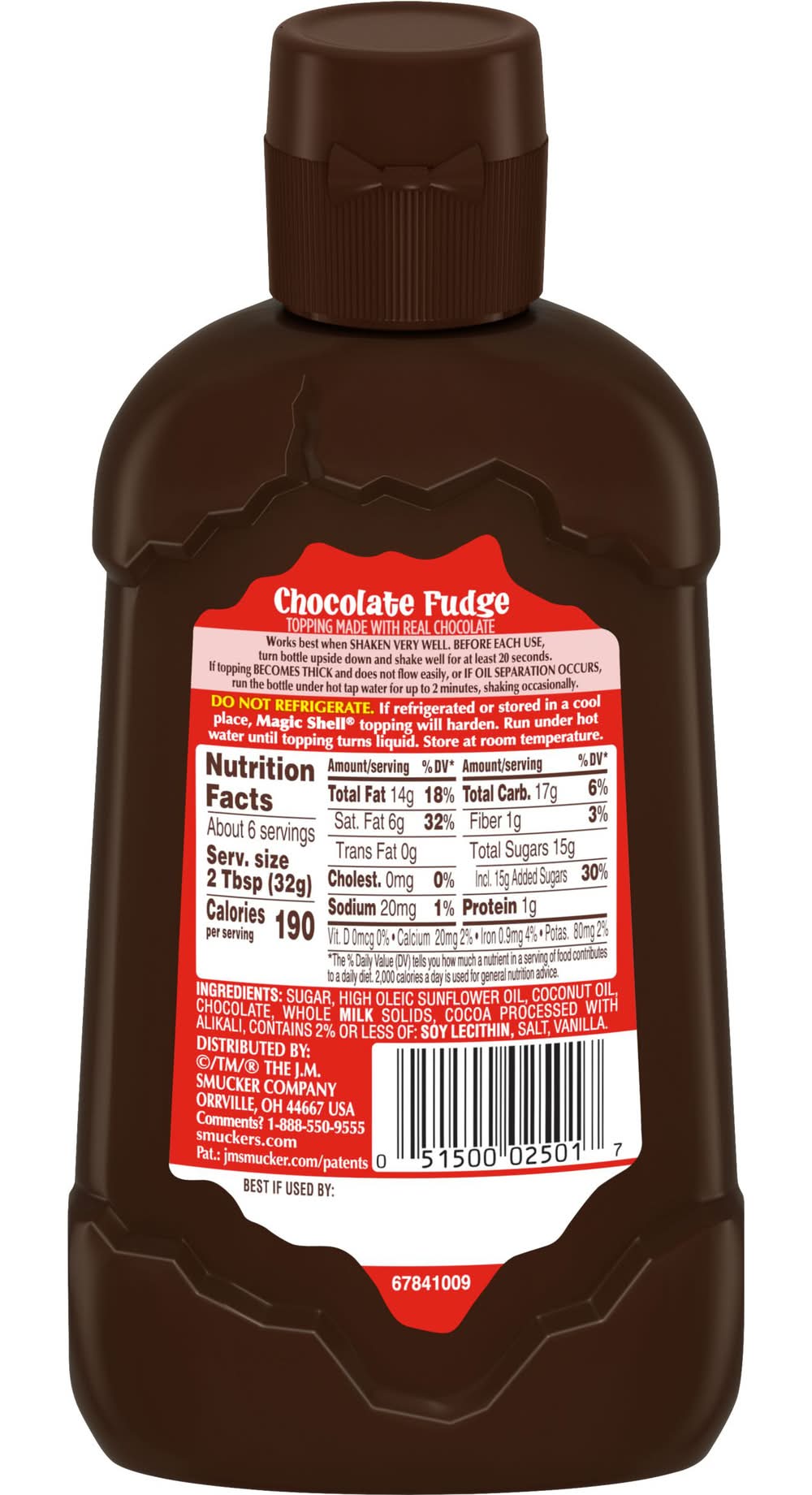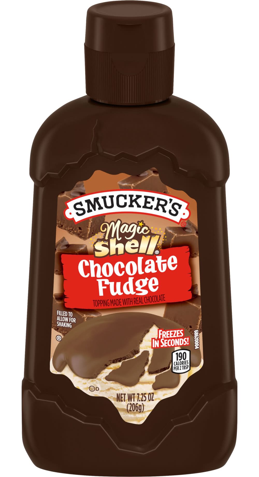 Savor every bite of rich, fudge flavor with Smuckers Magic Shell Chocolate Fudge Topping. Just like magic our ice cream topping freezes in seconds, creating a candy-coated shell that can be broken and mixed right in with the ice cream! Made with real chocolate with a full fudge flavor, your favorite ice cream sundaes and other creative homemade recipes will never be the same. Experience the magic and add more fun to your ice cream treats with Smuckers Magic Shell Chocolate Fudge Topping. • Flavor: Chocolate fudge • Jm Smucker, Orrville, OH 44667