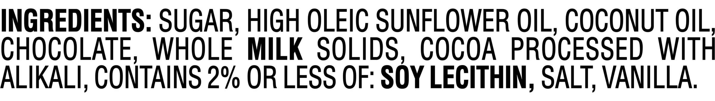 Ingredients: Sugar, High Oleic Sunflower Oil, Coconut Oil, Chocolate, Whole Milk Solids, Cocoa Processed With Alikali, Contains 2% Or Less Of: Soy Lecithin, Salt, Vanilla. Contains: Contains Milk And Soybean Ingredients.
