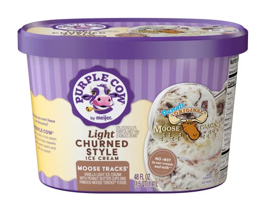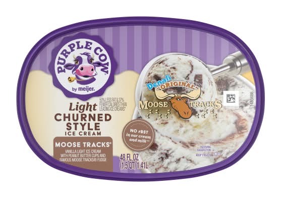 Purple Cow Light Churned Style Moose Tracks Ice Cream offers a lighter take on the classic Moose Tracks flavor. It combines a vanilla ice cream base with peanut butter cups and Moose Tracks fudge swirls, crafted to deliver an extra creamy texture. This product provides a delightful blend of ingredients for those who enjoy indulgent flavors with a smooth finish.