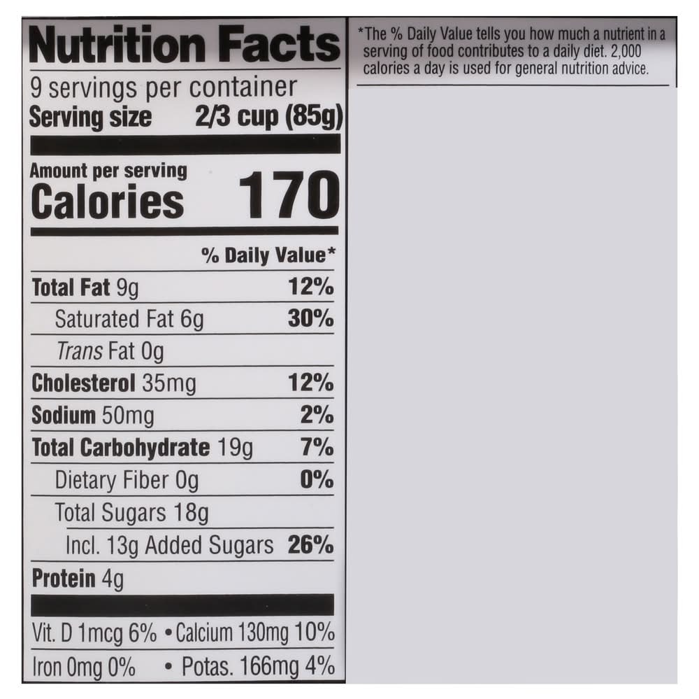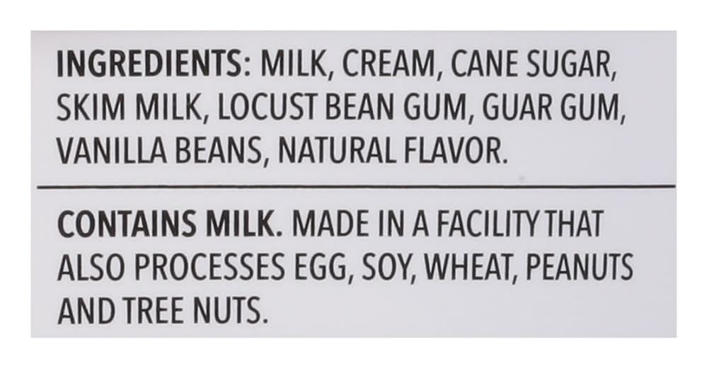 Ingredients: Milk, Cream, Cane Sugar, Skim Milk, Locust Bean Gum, Guar Gum, Vanilla Beans, Natural Flavor Contains: Milk, Corn, Eggs, Soybeans, Wheat, Peanuts, Tree Nuts
