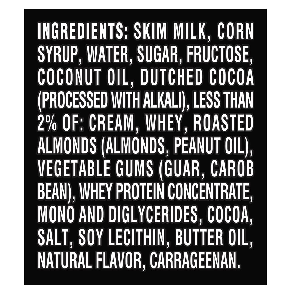 Ingredients: Milk, Sugar, Corn Syrup, Cream, Dutched Cocoa Processed with Alkali, Coconut Oil, Less than 2% of: Whey Roasted Almonds Almonds, Peanut Oil, Vegetable Gums Carob Bean, Guar, Tara, Whey Protein Concentrate, Mono and Diglycerides, Cocoa, Salt, Soy Lecithin, Butter Oil, Natural Flavor, Carrageenan, Vitamin A Palmitate, Water. Contains: Milk, Corn, Tree Nuts, Coconuts, Almonds, Peanuts, Soybeans