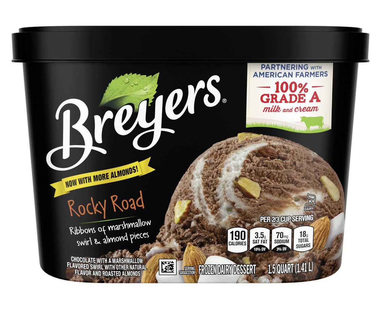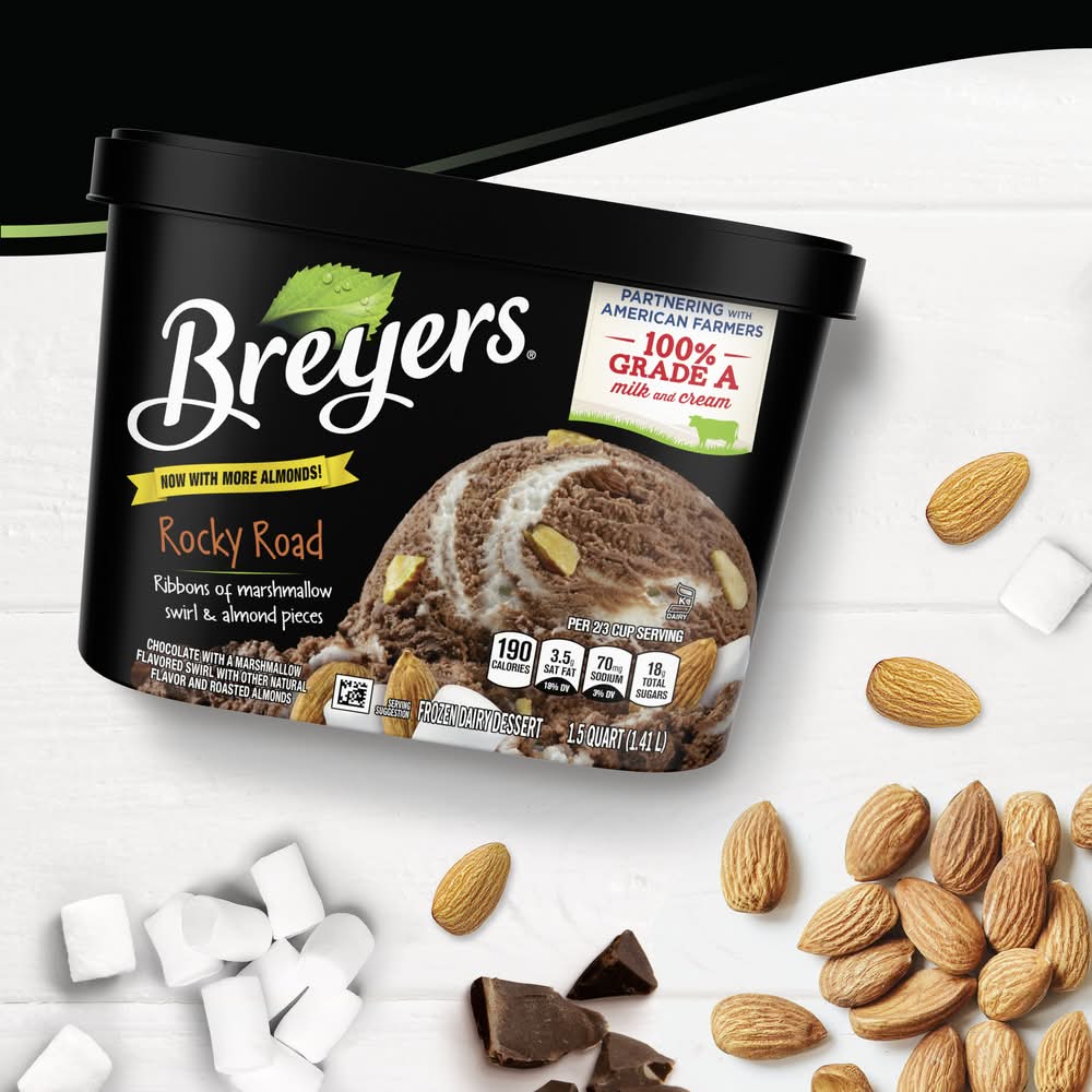 Deliciously gooey marshmallow swirled through rich chocolate Breyers and real almond pieces. Breyers Rocky Road is the fastest road to fun! Love Breyers chocolate ice cream as a frozen dessert? Well, this frozen dairy dessert, made with rich cocoa, will be sure to be your new favorite. Our philosophy is to start with the high-quality ingredients to make great-tasting ice cream and frozen dairy desserts. In our Breyers Rocky Road frozen treat, we start with 100% Grade A milk and cream from American cows not treated with artificial growth hormones*, colors and flavors from natural sources**, and sustainably farmed fruit and vanilla**. Our commitment to high-quality ingredients comes from our founder, William Breyer, who in 1866 made a Pledge of Purity for his ice cream business in Philadelphia. He had a philosophy of using only the best, and we also believe that the quality of our ingredients makes delicious ice cream and frozen dairy desserts. Give it a try and leave us a review at Breyers.com or follow us @Breyers on Instagram! * The FDA states that no significant difference has been shown between dairy derived from rBST-treated and non-rBST-treated cows. ** Our product, before the inclusion of any candies, cookies, sauces, or fruit from other suppliers, will fully abide by this claim. Raspberries are not sustainably farmed. • Flavor: Chocolate with marshmallow • Unilever, Englewood Cliffs, NJ, 07632, USA
