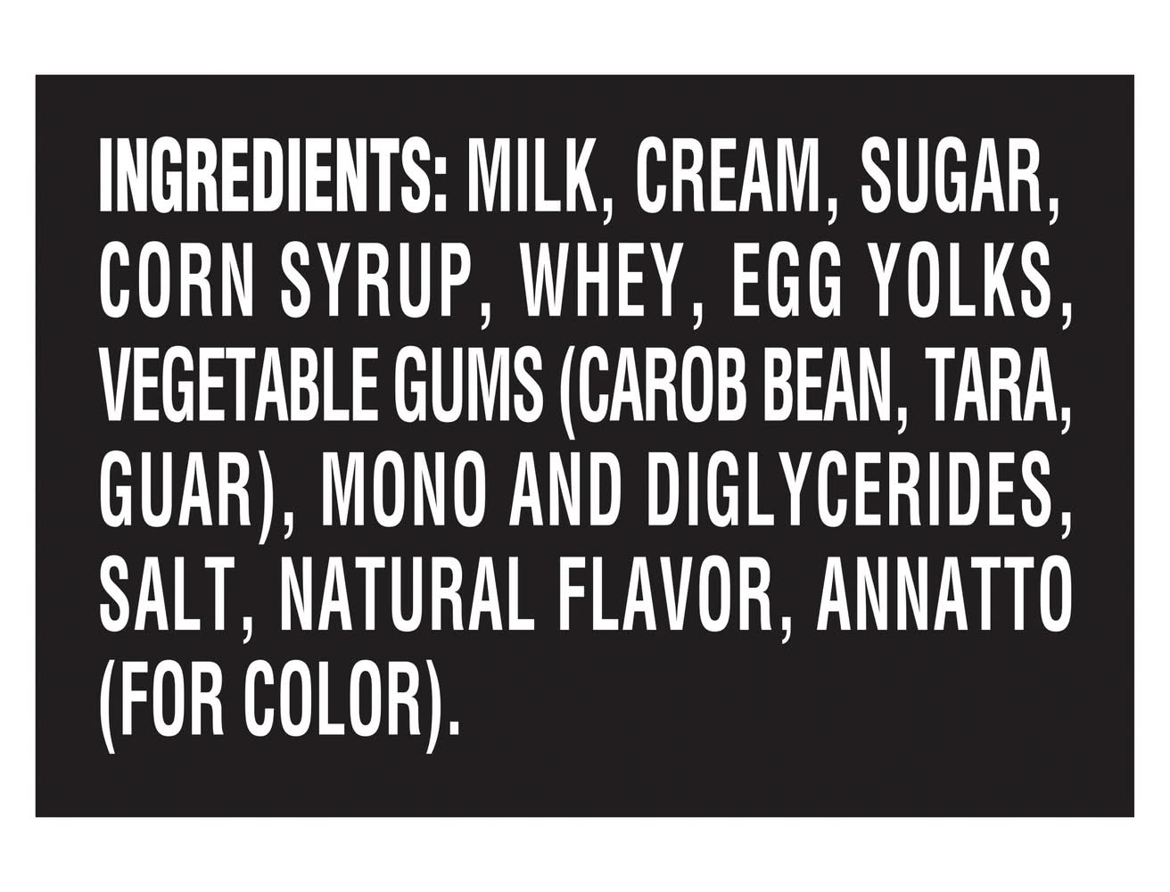 Ingredients: Milk, Cream, Sugar, Corn Syrup, Whey, Egg Yolks, Vegetable Gums Carob Bean, Tara, Guar, Mono and Diglycerides, Salt, Natural Flavor, Annatto for Color. Contains: Milk, Corn, Eggs