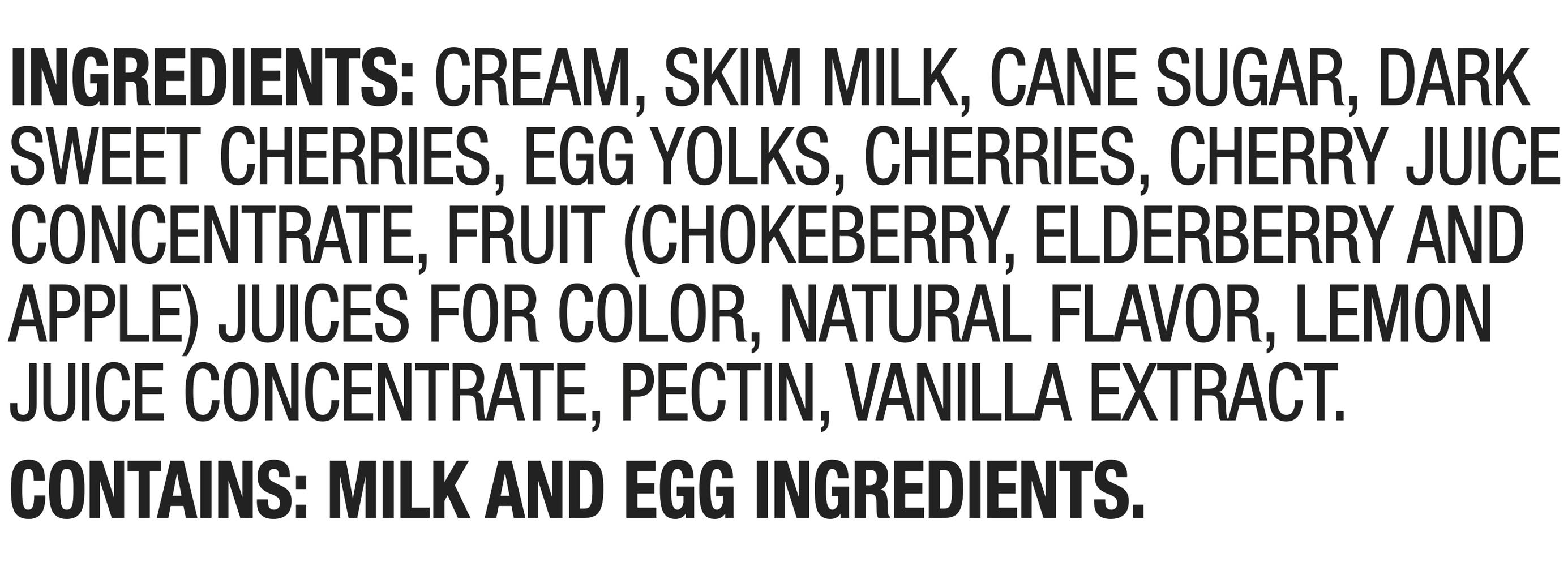 Ingredients: CREAM, SKIM MILK, CANE SUGAR, DARK SWEET CHERRIES, EGG YOLKS, CHERRIES, CHERRY JUICE CONCENTRATE, FRUIT (CHOKEBERRY, ELDERBERRY AND APPLE), JUICES FOR COLOR, NATURAL FLAVOR, LEMON JUICE CONCENTRATE, PECTIN, VANILLA EXTRACT. Contains: Milk, Eggs