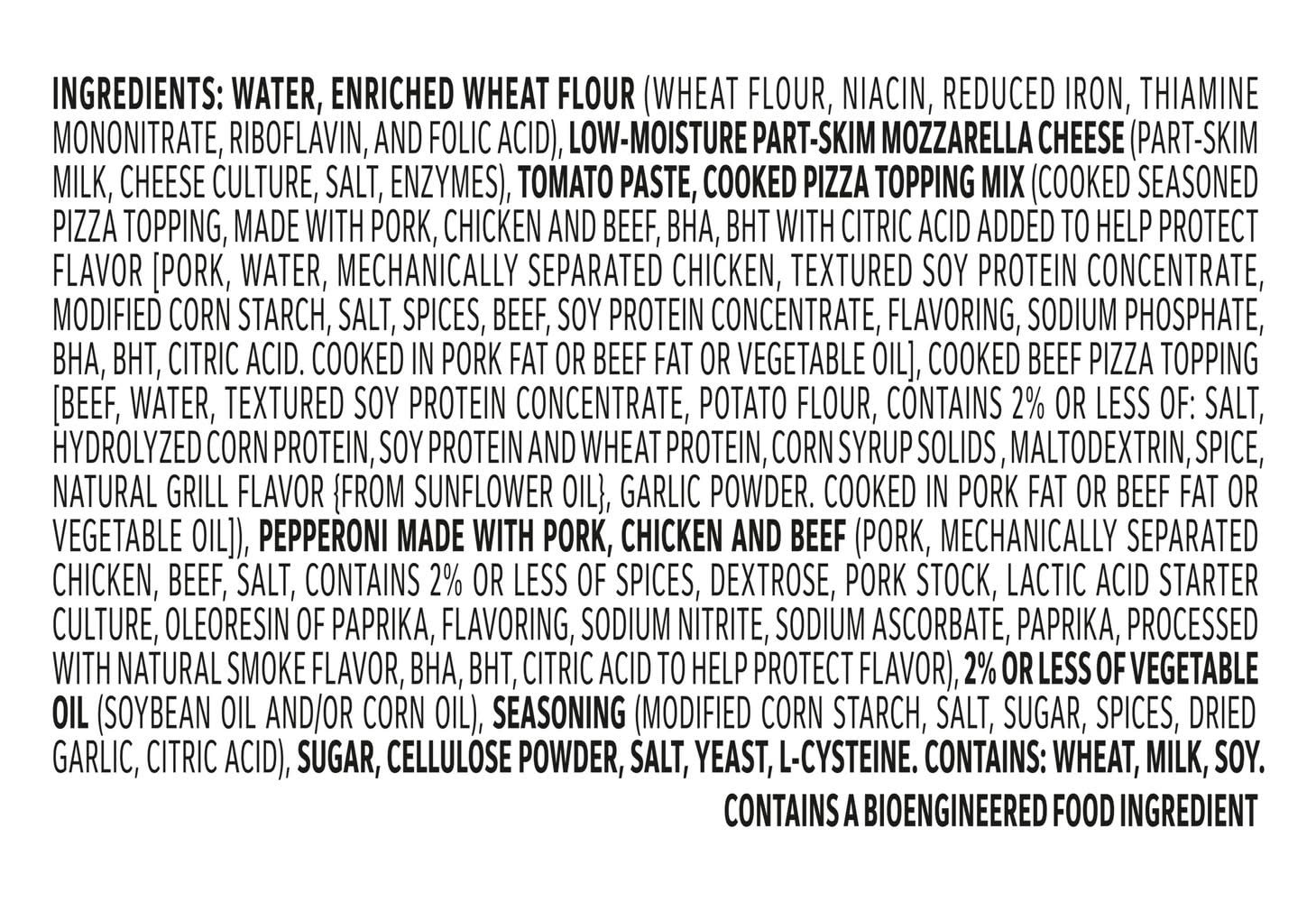 Ingredients: Water, Enriched Wheat and Malted Barley Flour Wheat Flour, Malted Barley Flour, Niacin, Reduced Iron, Thiamin Mononitrate, Riboflavin Folic Acid, Low-Moisture Part-Skim Mozzarella Cheese Part-Skim Milk, Cheese Culture, Salt, Enzymes, Tomato Paste, Cooked Pizza Topping Mix Cooked Seasoned Pizza Topping, Made with Pork, Chicken and Beef, BHA, BHT with Citric Acid Added to Help Protect Flavor [Pork, Water, Mechanically Separated Chicken, Textured Soy Protein Concentrate, Modified Corn Starch, Salt, Spices, Beef, Soy Protein Concentrate, Flavoring, Sodium Phosphate, BHA, BHT, Citric Acid, Cooked in Pork Fat or Beef Fat or Vegetable Oil], Cooked Beef Pizza Topping [Beef, Water, Textured Soy Protein Concentrate, Potato Flour, Contains 2% or Less of: Salt, Hydrolyzed Corn Protein, Soy Protein and Wheat Protein, Corn Syrup Solids, Maltodextrin, Spice, Natural Grill Flavor {from Sunflower Oil}, Garlic Powder, Cooked in Pork Fat or Beef Fat or Vegetable Oil], Pepperoni Made with Pork, Chicken and Beef Pork, Mechanically Separated Chicken, Beef, Salt, Contains 2% or Less of Spices, Dextrose Pork Stock, Lactic Acid Starter Culture, Oleoresin of Paprika, Flavoring, Sodium Nitrite, Sodium Ascorbate, Paprika, Processed with Natural Smoke Flavor, BHA BHT, Citric Acid to Help Protect Flavor, 2% or Less of Vegetable Oil Soybean Oil and/or Corn Oil, Seasoning Modified Corn Starch, Salt, Sugar, Spices, Dried Garlic, Citric Acid, Sugar, Cellulose Powder, Salt, Yeast, Soy Lecithin, L-Cysteine. Contains: CONTAINS: WHEAT, MILK, SOY.