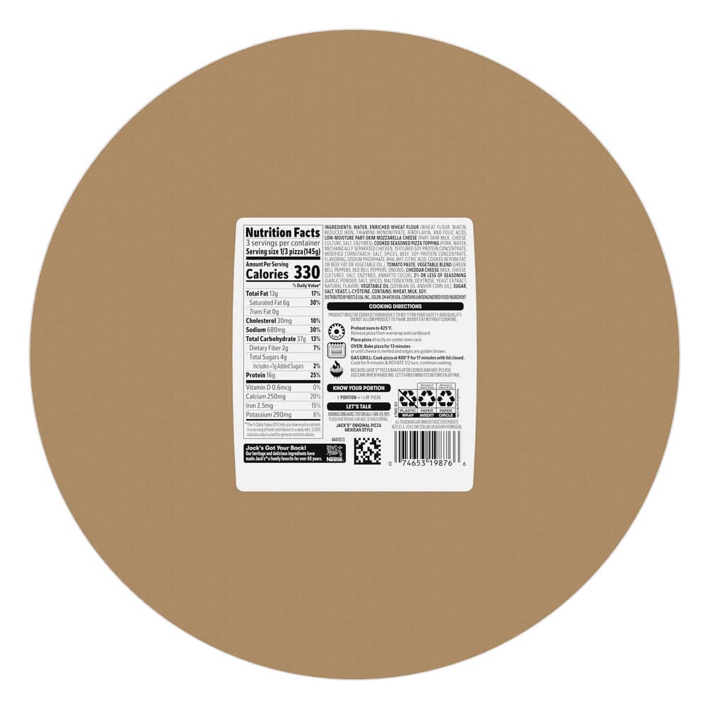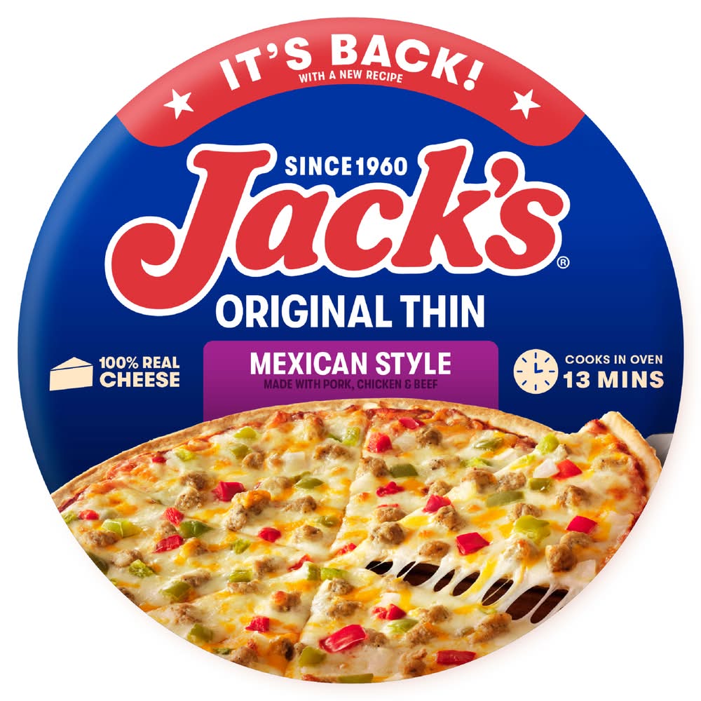 Introducing Jack’s Thin Crust Mexican Style Cheese and Sausage Pizza, a delicious blend of cheese, and sausage. Jack’s pizza will become your family’s favorite freezer food. Jack’s has been a trusted brand since 1960, known for their heritage and delicious ingredients. Our frozen pizzas are topped with 100% real cheese, adding a creamy and savory taste to every bite. This pizza with sausage pieces is easy to make on a gas grill at 400°F for seventeen minutes. Or by preheating your oven to 425°F and placing the pizza directly on the center oven rack. Enjoy a delicious Jack’s Mexican style sausage and cheese Pizza fresh from the oven right in the comfort of your home. Packaging: Reusable