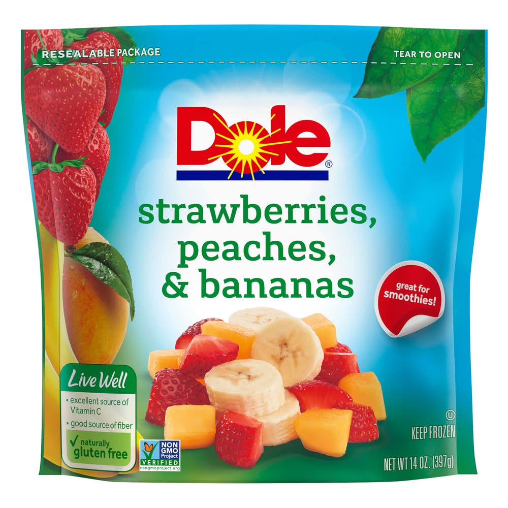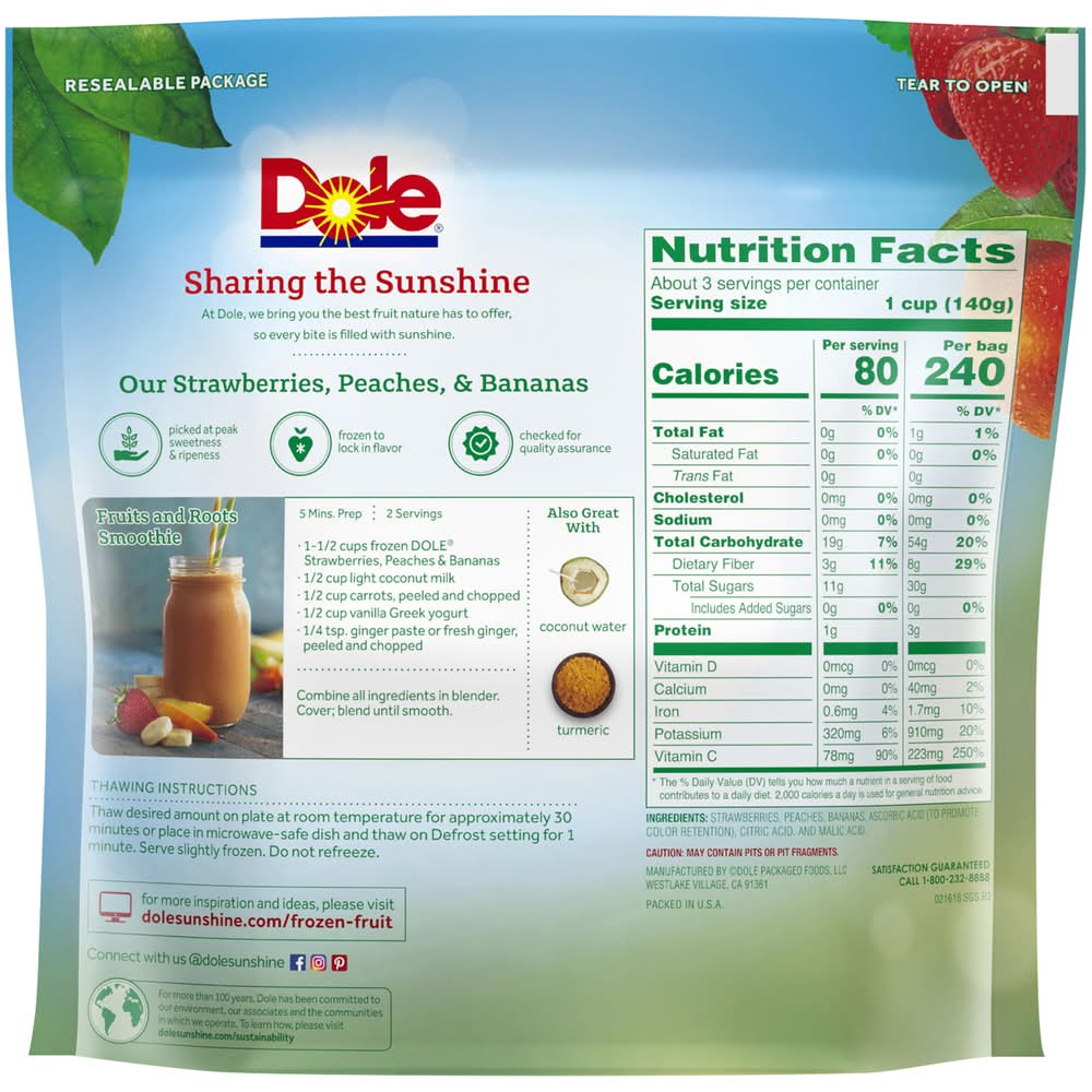 Great for smoothies! Live well. Sharing the Sunshine: At Dole, we bring you the best fruit nature has to offer, so every bite is filled with sunshine. Our Strawberries, Peaches, & Bananas: Picked at peak sweetness & ripeness; frozen to lock in flavor.