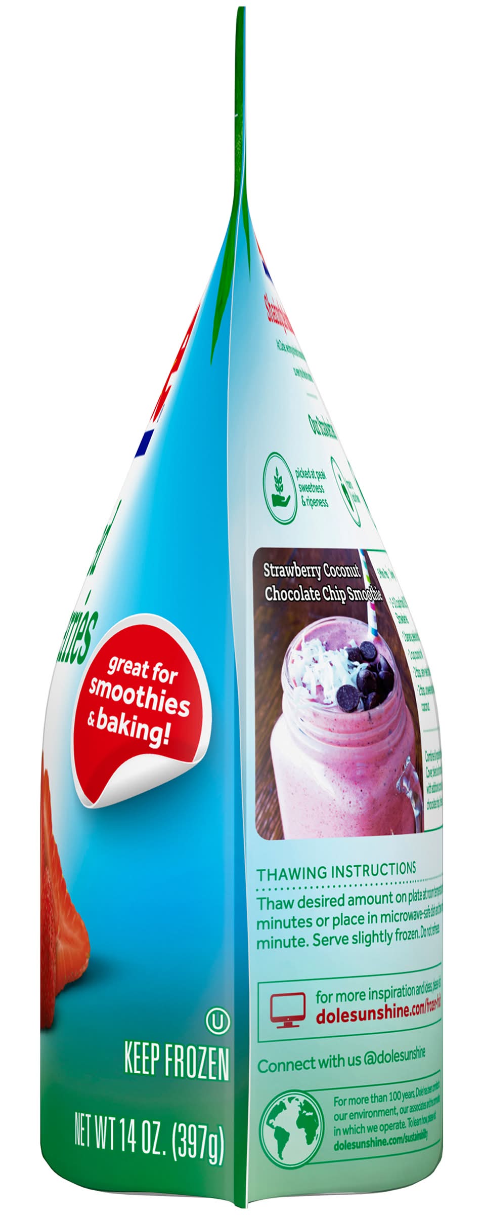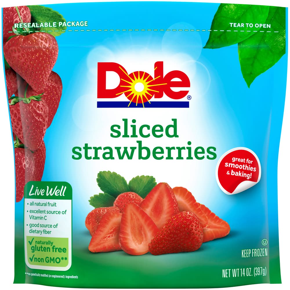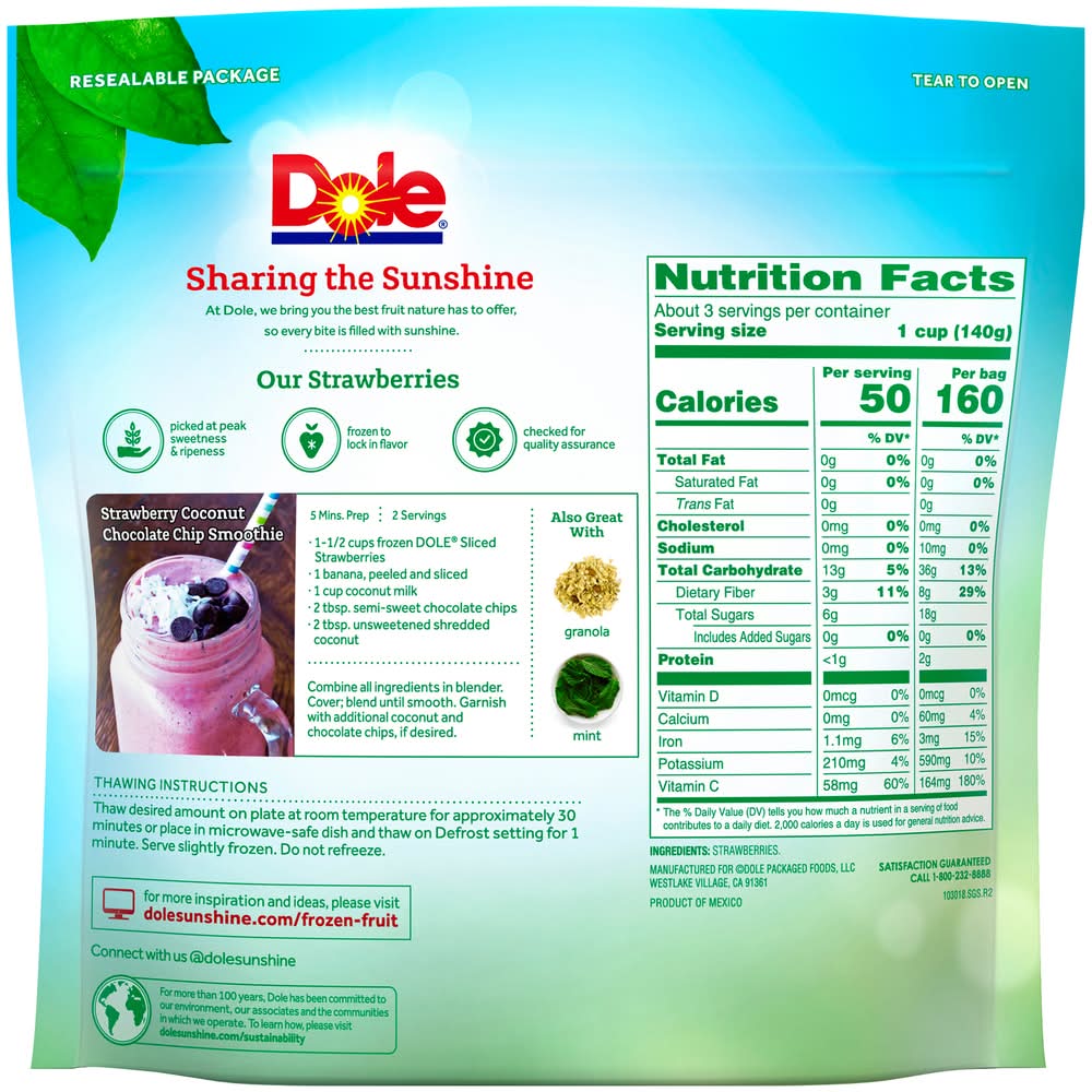 Naturally gluten free. Excellent source of vitamin C. Good source of dietary fiber. Non GMO (No generically modified (or engineered) ingredients). Great for smoothies & baking! Live Well: All natural fruit. Sharing the Sunshine: At Dole, we bring you the best fruit nature has to offer, so every bite is filled with sunshine. Our Strawberries: Picked at peak sweetness & ripeness; frozen to lock in flavor; checked for quality assurance. Satisfaction guaranteed. dolesunshine.com/frozen-fruit. Connect with us (at)dole sunshine: Facebook. Instagram. Pinterest. Resealable package. For more than 100 years, Dole has been committed to our environment, our associates and the communities in which we operate. Product of Mexico. Sharing the Sunshine At Dole, we bring you the best fruit nature has to offer, so every bite is filled with sunshine.; Our Strawberries Picked at peak sweetness & ripeness. Frozen to lock in flavor. Checked for quality assurance.; For more than 100 years, Dole has been committed to our environment, our associates and the communities in which we operate. At Dole, we bring you the best fruit nature has to offer, so every bite is filled with sunshine.; Our Strawberries Dole Packaged Foods, Westlake Village, CA, 91361