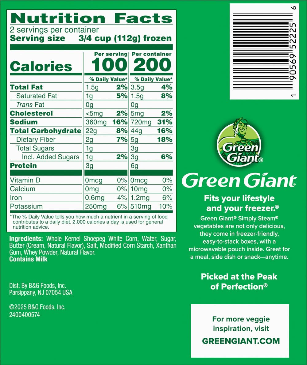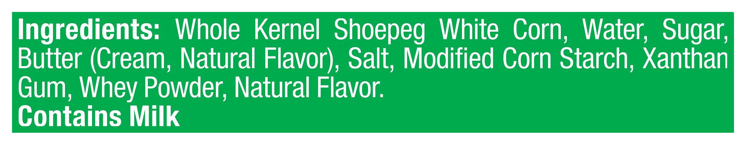 Ingredients: Whole Kernel Shoepeg White Corn, Water, Sugar, Butter (Cream, Natural Flavor), Salt, Modified Corn Starch, Xanthan Gum, Whey Powder, Natural Flavor Contains: Milk