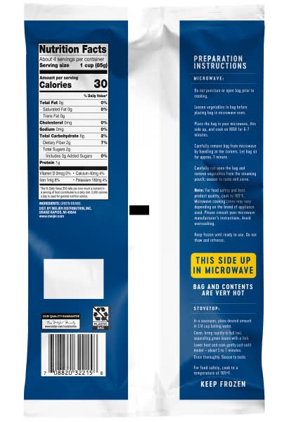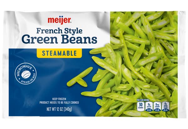 Meijer Steamable French-Style Green Beans are prepared by steaming and are designed for quick preparation. Picked at peak ripeness, these beans are noted for their freshness and are described as nutritious. They provide the taste of fresh green beans and come in a French-style cut.