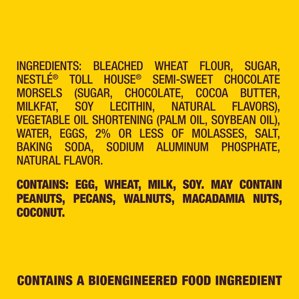 Ingredients: BLEACHED WHEAT FLOUR, SUGAR, NESTLÉ® TOLL HOUSE® SEMI-SWEET CHOCOLATE MORSELS (SUGAR, CHOCOLATE, COCOA BUTTER, MILKFAT, SOY LECITHIN, NATURAL FLAVORS), VEGETABLE OIL SHORTENING (PALM OIL, SOYBEAN OIL), WATER, EGGS, 2% OR LESS OF MOLASSES, SALT, BAKING SODA, SODIUM ALUMINUM PHOSPHATE, NATURAL FLAVOR. Contains: CONTAINS: EGG, WHEAT, MILK, SOY. MAY CONTAIN PEANUTS, PECANS, WALNUTS, MACADAMIA NUTS, COCONUT.