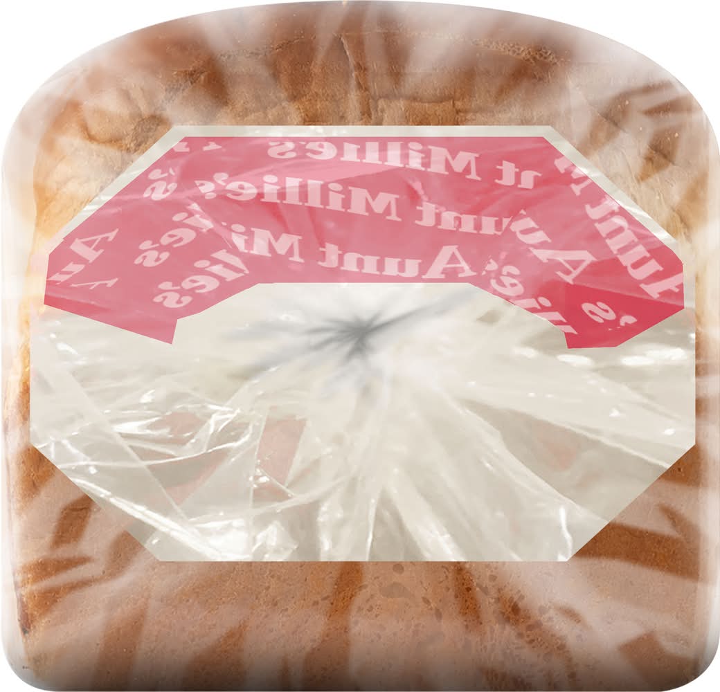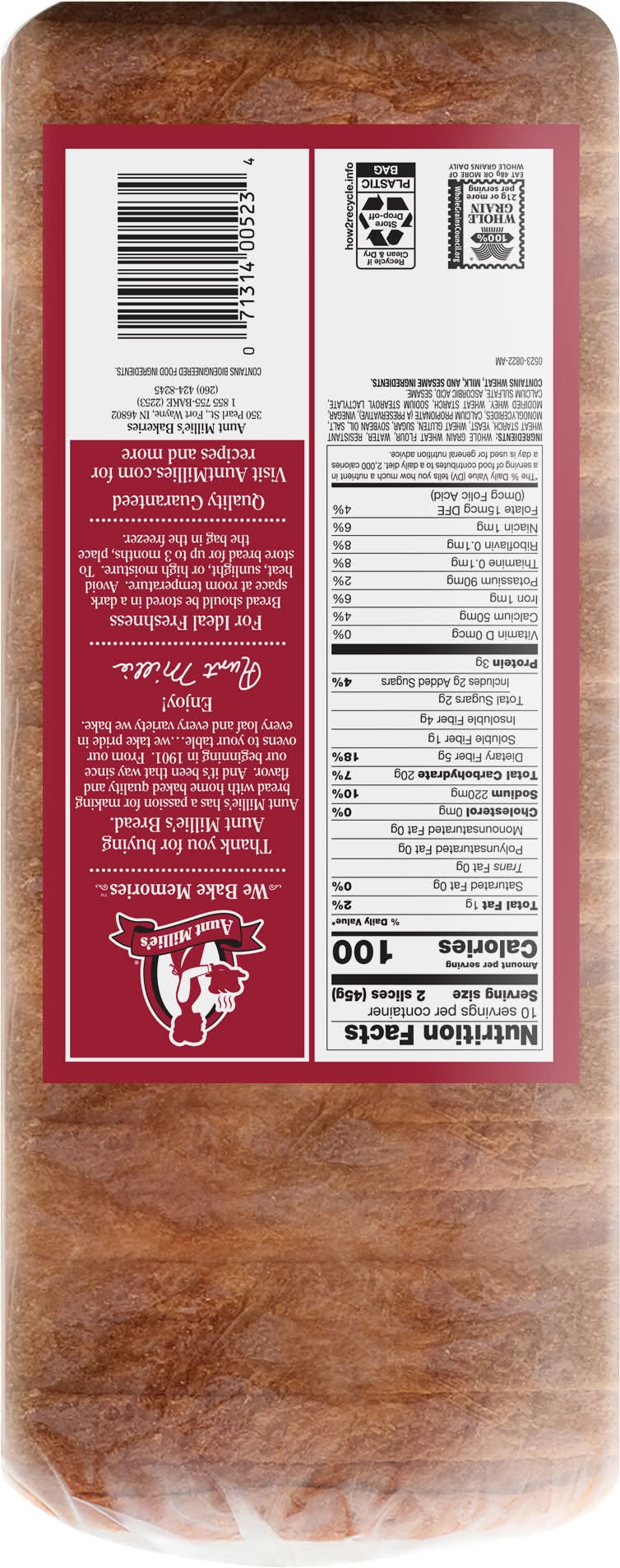 Per 2 Slices: 100 calories; 0 g sat fat (0% DV); 220 mg sodium (10% DV); 2 g total sugars. 0 g zero grams of trans fat. 100% whole grain 21 g or more per serving. Eat 48 g or more of whole grains daily. wholegrainscouncil.org. Contains bioengineered food ingredients. Family owned bakery since 1901. No high fructose corn syrup. We Bake Memories: Thank you for buying Aunt Millie's Bread. Aunt Millie's has a passion for making bread with home baked quality and flavor. And it's been that way since our beginning in 1901. From our ovens to your table - we take pride in every loaf and every variety we bake. Enjoy! - Aunt Millie. Quality guaranteed. • Aunt Millie's Bakeries, 350 Pearl St. , Fort Wayne , IN , 46802 • Packaging: Reusable