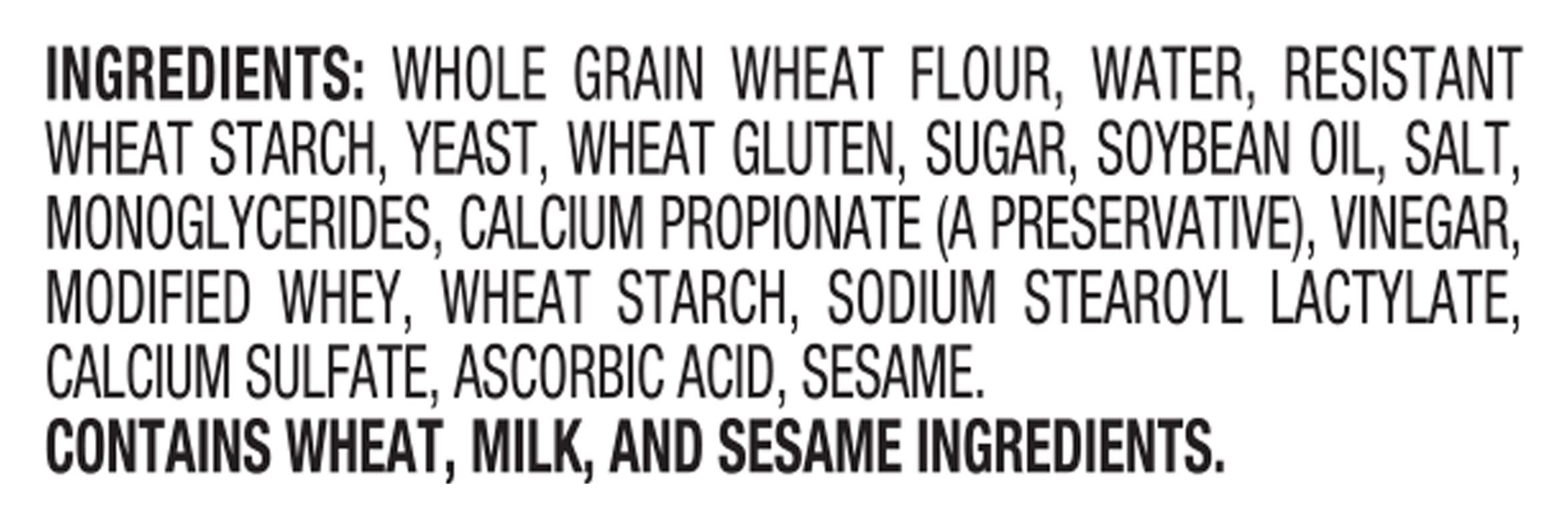 Ingredients: Whole Grain Wheat Flour, Water, Resistant Wheat Starch, Yeast, Wheat Gluten, Sugar, Soybean Oil, Salt, Monoglycerides, Calcium Propionate (a Preservative), Vinegar, Modified Whey, Wheat Starch, Sodium Stearoyl Lactylate, Calcium Sulfate, Ascorbic Acid, Sesame Contains: Wheat, Soybeans, Gluten