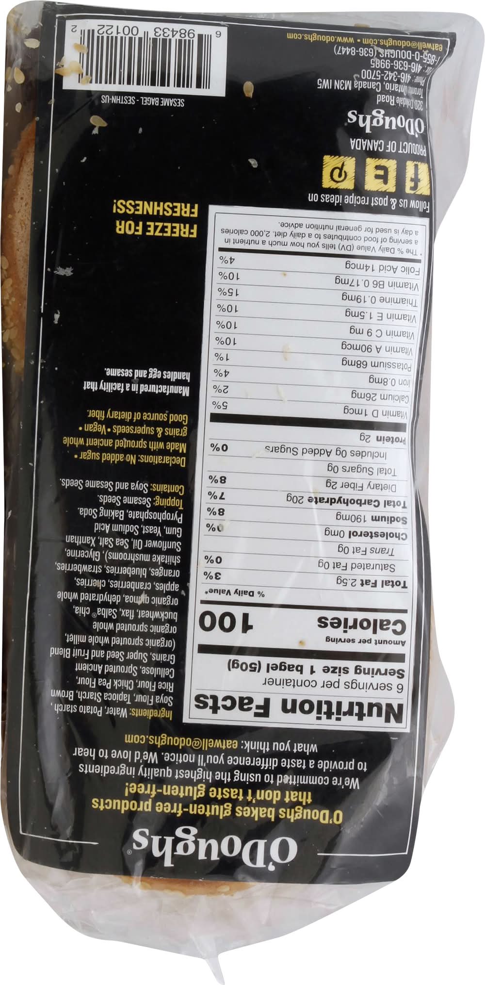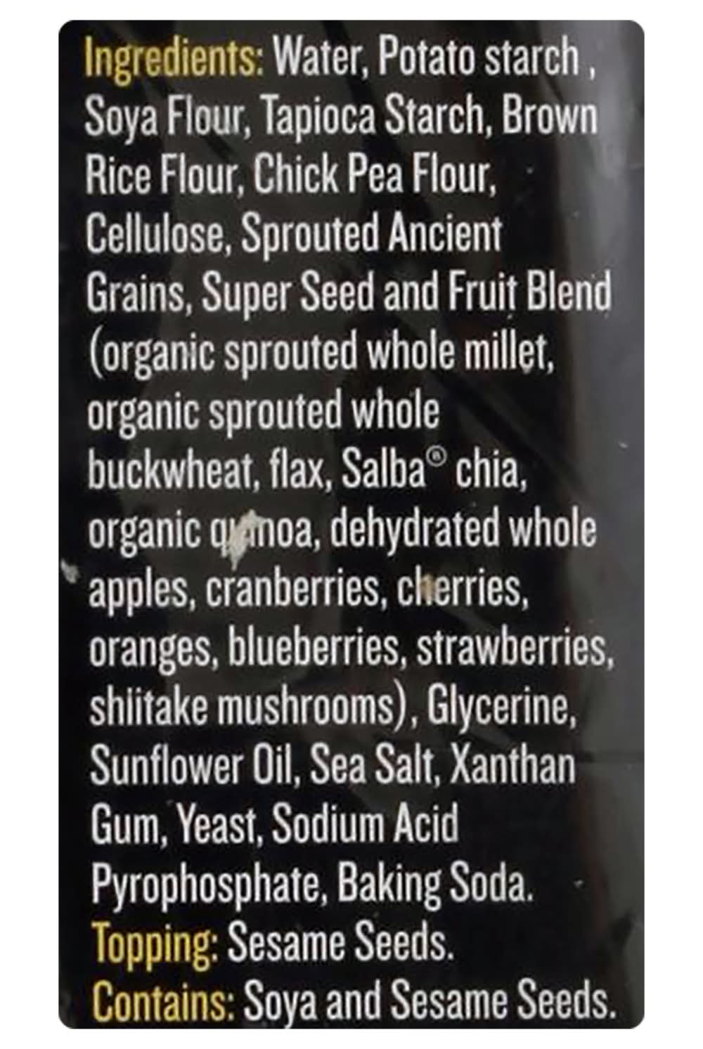 Ingredients: Water, Potato Starch, Soya Flour, Tapioca Starch, Brown Rice Flour, Chick Pea Flour, Cellulose, Sprouted Ancient Grains, Super Seed and Fruit Blend (Organic Sprouted Whole Millet, Organic Sprouted Whole Buckwheat, Flax, Salba Chia, Organic Quinoa, Dehydrated Whole Apples, Cranberries, Cherries, Oranges, Blueberries, Strawberries, Shiitake Mushrooms), Glycerine, Sunflower Oil, Sea Salt, Xanthan Gum, Yeast, Sodium Acid Pyrophosphate, Baking Soda. Topping: Sesame Seeds Contains: Eggs, Wheat, Soybeans