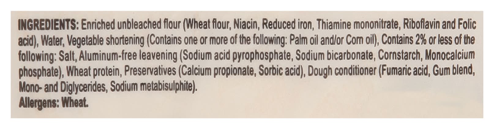 Ingredients: Enriched Unbleached Flour (Wheat Flour, Niacin, Reduced Iron, Thiamine Mononitrate, Riboflavin and Folic Acid), Water, Vegetable Shortening (Contains One or More of the Following: Palm Oil and/or Corn Oil), Contains 2% or Less of the Following: Salt, Aluminum-Free Leavening (Sodium Acid Pyrophosphate, Sodium Bicarbonate, Cornstarch, Monocalcium Phosphate), Wheat Protein, Preservatives (Calcium Propionate, Sorbic Acid), Dough Conditioner (Fumaric Acid, Gum Blend, Mono-and Diglycerides, Sodium Metabisulphite) Contains: Wheat