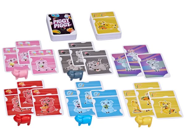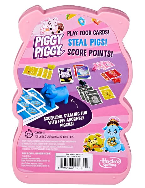 Hog it all to win! The Piggy Piggy game is a fast-paced family card game that's as easy as it is fun! Players take turns playing food cards from their hand to try to steal pigs and score the most points. Each player starts with 5 cards, including colored food cards, such as tacos (yellow) and ice cream (pink). On their turn, a player plays all the cards they have from one type of food by placing it in a stack. If their stack has the most food, then they earn the same-colored pig figure-or can steal it from another player! Have a goat card? Use it to sabotage an opponent by discarding a food card from their stack and maybe forcing them to give up their pig! When a player redraws cards at the end of their turn, if they have any pigs, they'll score a point for each drawn card that matches their pig's color. Score 8 points first to win! The Piggy Piggy game is a fantastic choice for those looking for fun card games for kids and adults.Piggy Piggy and all related characters are trademarks of Hasbro.Includes 108 cards, 5 pig figures, and game rules.Ages 7 and upFor 2 to 6 players.