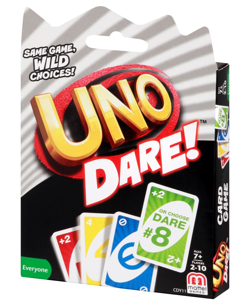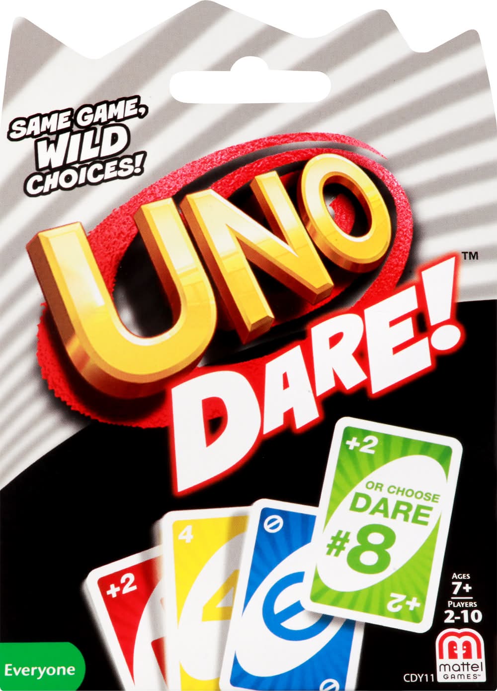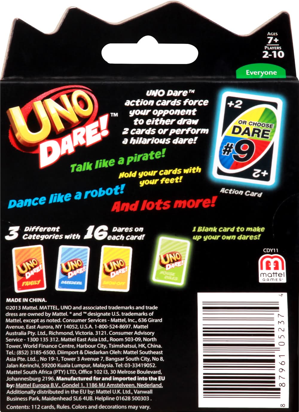Uno Dare is a card game for 2 to 10 players aged 7 and up, featuring action cards that offer a choice between drawing cards or performing one of 48 humorous dares. It includes 112 cards, a rule sheet, and a blank card for custom dares, adhering to ASTM safety standards.