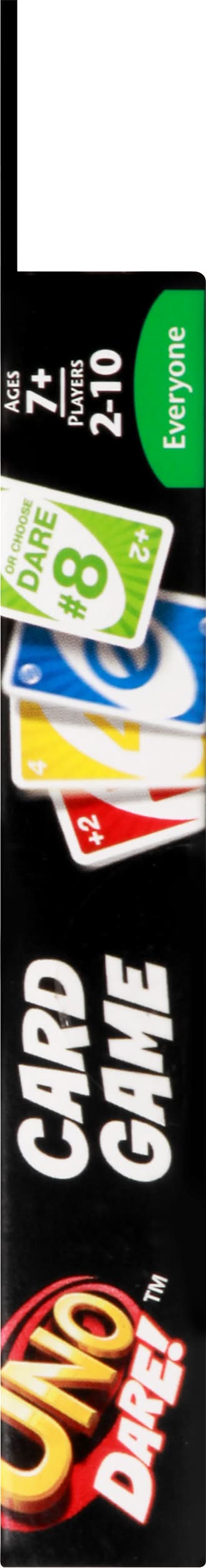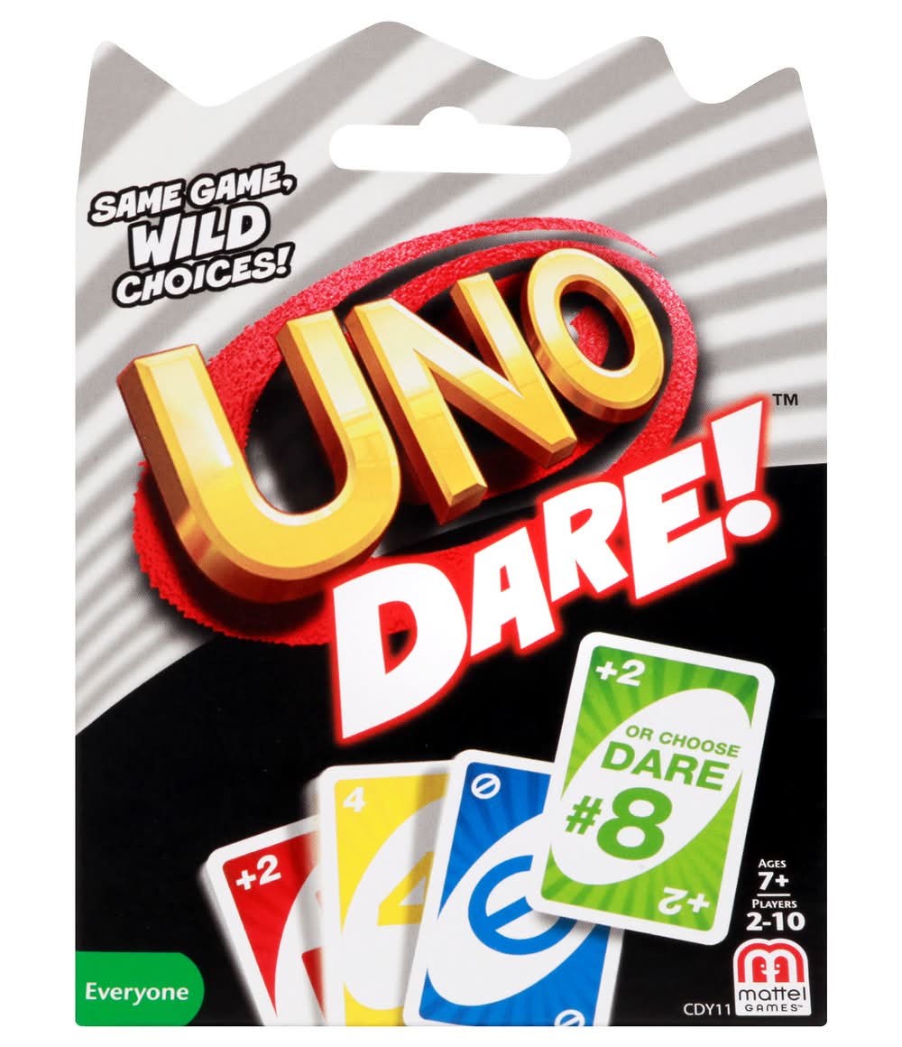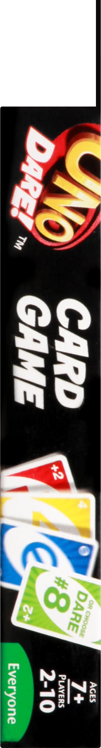 Uno Dare is a card game for 2 to 10 players aged 7 and up, featuring action cards that offer a choice between drawing cards or performing one of 48 humorous dares. It includes 112 cards, a rule sheet, and a blank card for custom dares, adhering to ASTM safety standards.