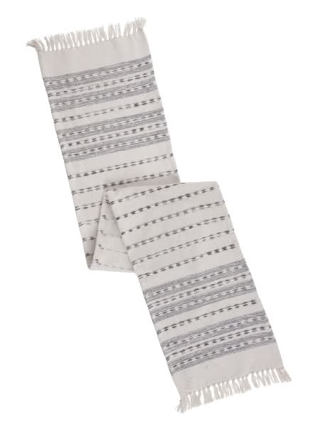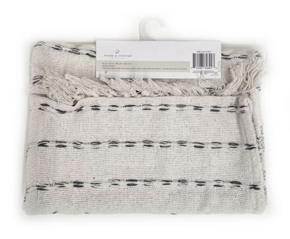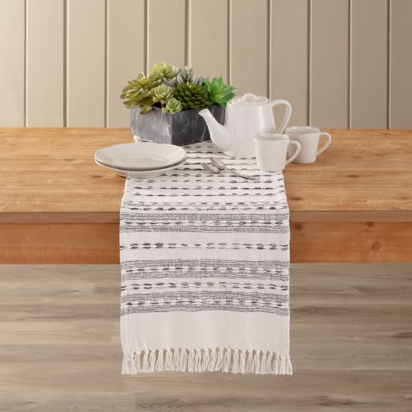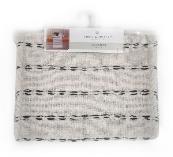 The Room & Retreat, Pebble Path Stripe Runner, is 13 in x 72 in, and is a multi colored, neutal based striped pattern. The neutral colors will coordinate with most any color decor you have. The runner is suitable for both dining room and kitchen table.It is also available in a coordinating placemat.